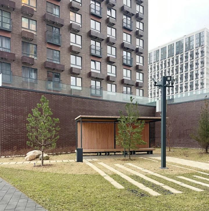 Двор-парк, где предусмотрены места для отдыха, спортивные и детские площадки