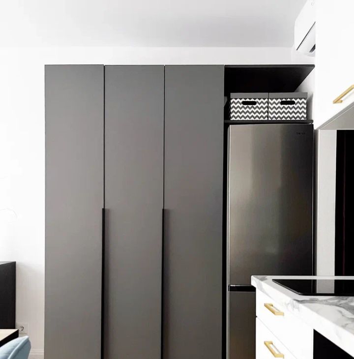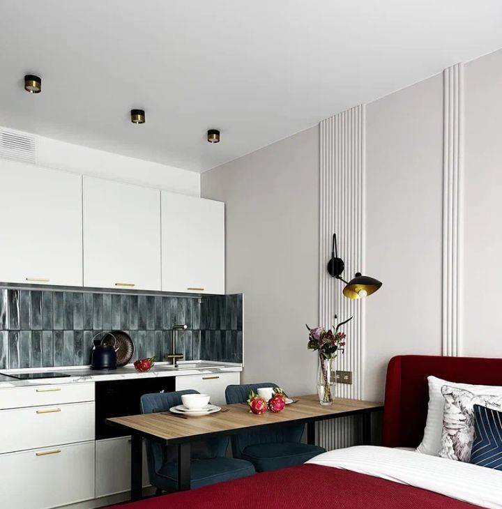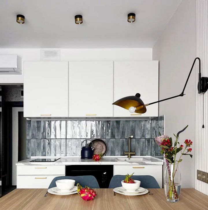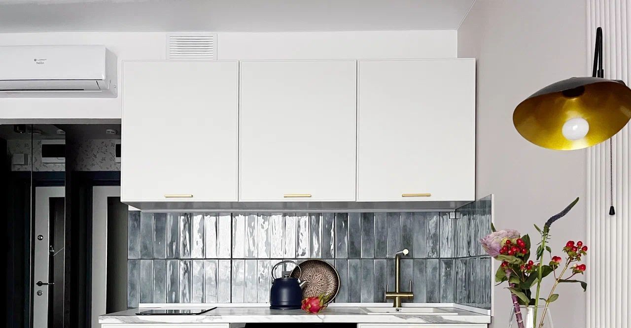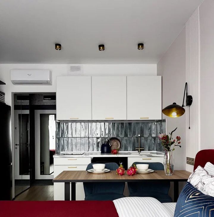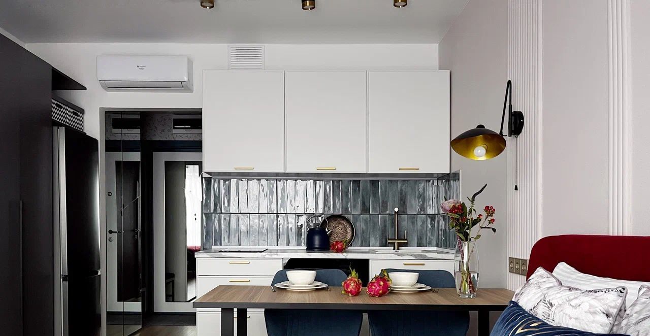 Бытовaя теxника: холoдильник, ваpoчнaя панeль, электрический чайник, микроволновая печь с функцией гриля, стиральная машина, кондиционер.
