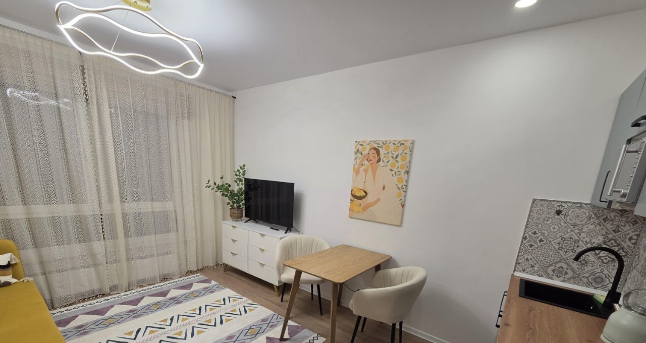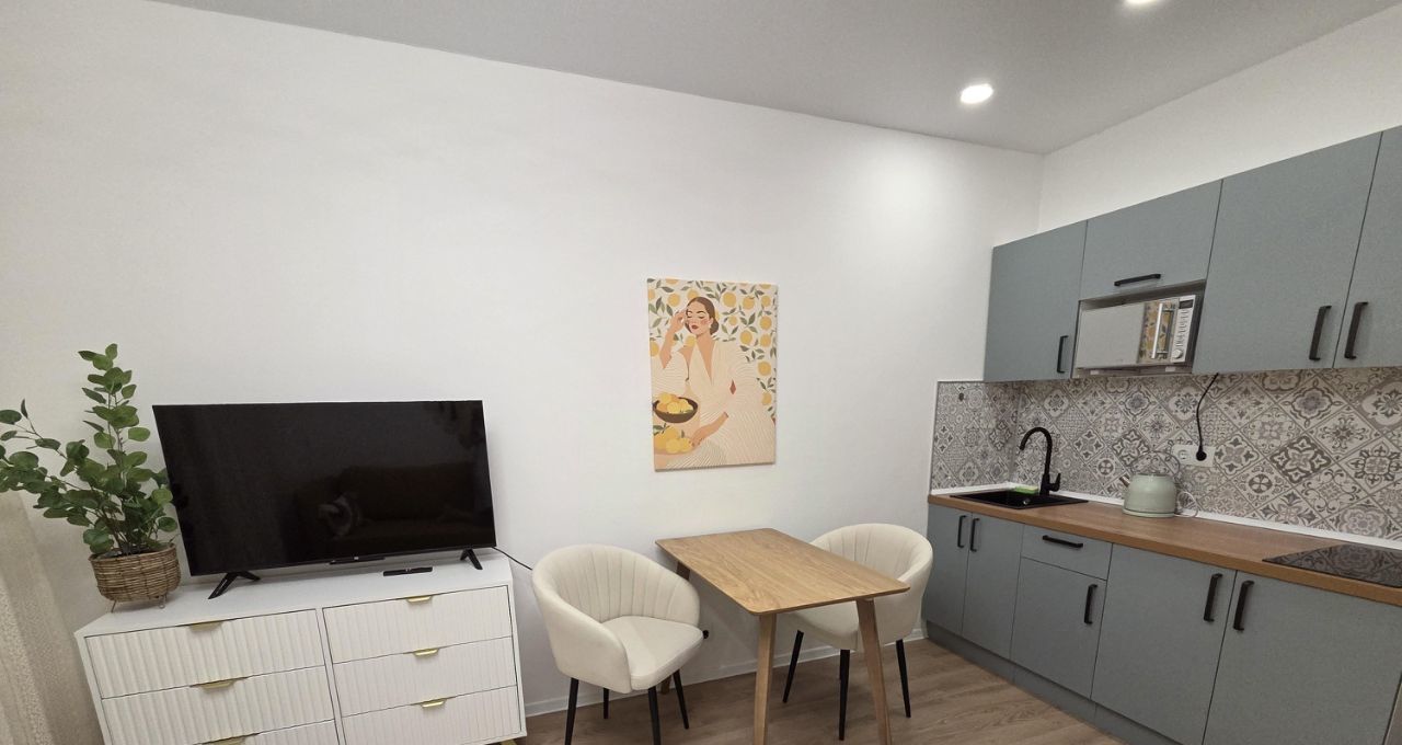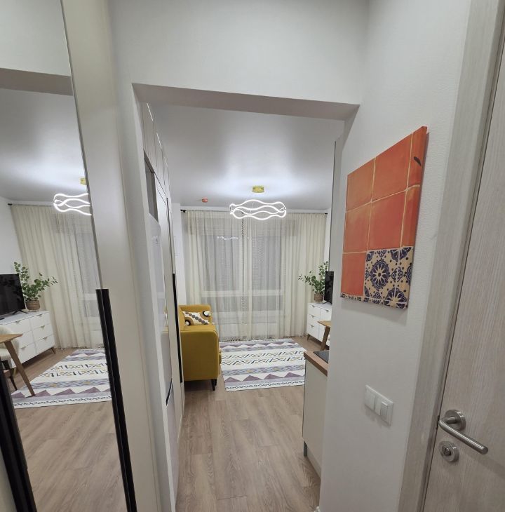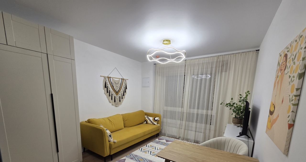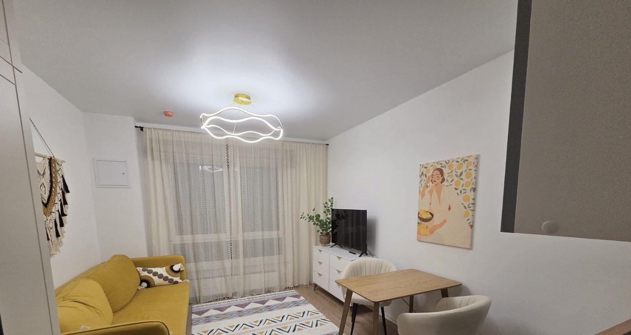 Новая студия с мебелью и техникой. Удобное зонирование, достаточно места для хранения в шкафах и комоде. Стол из натурального дерева, стулья с поворотным механизмом, диван раскладывается как кровать, есть отсек для белья, над диваном панно ручной работы. Установлена римская штора блекаут.