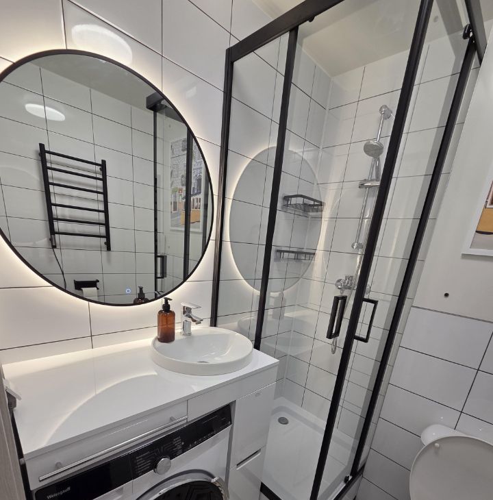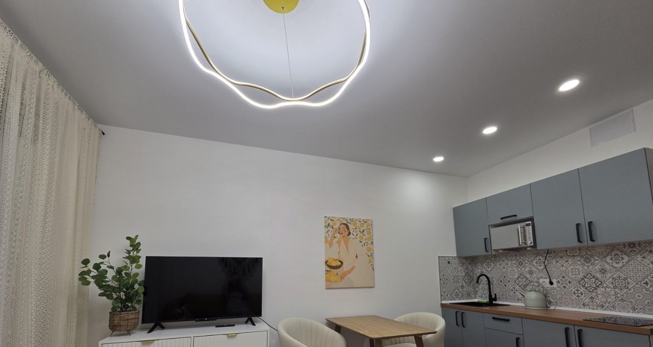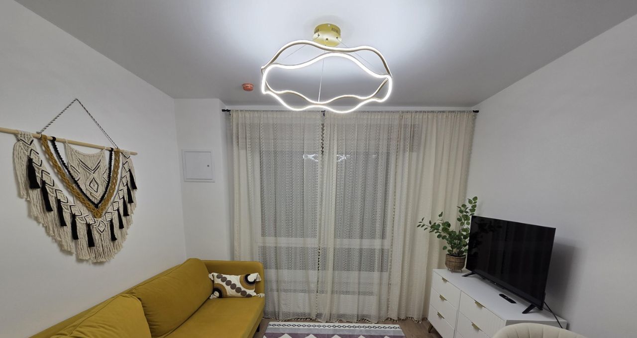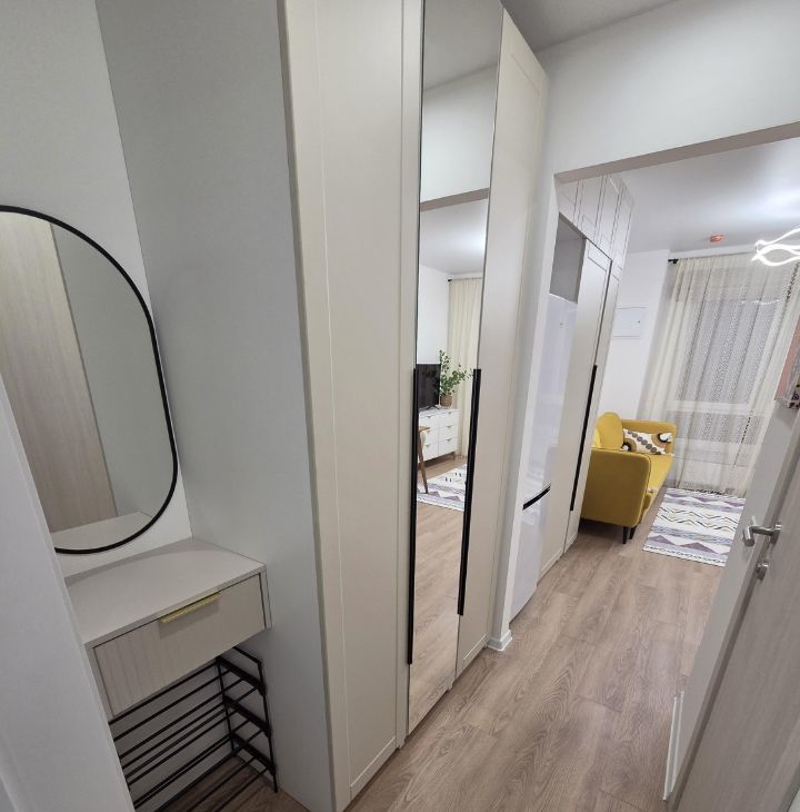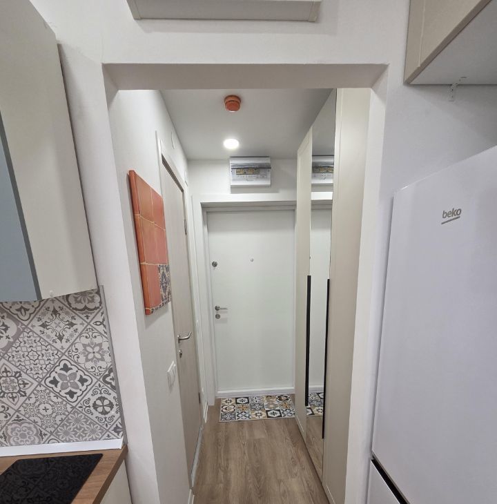 Новая студия с мебелью и техникой. Удобное зонирование, достаточно места для хранения в шкафах и комоде. Стол из натурального дерева, стулья с поворотным механизмом, диван раскладывается как кровать, есть отсек для белья, над диваном панно ручной работы. Установлена римская штора блекаут.