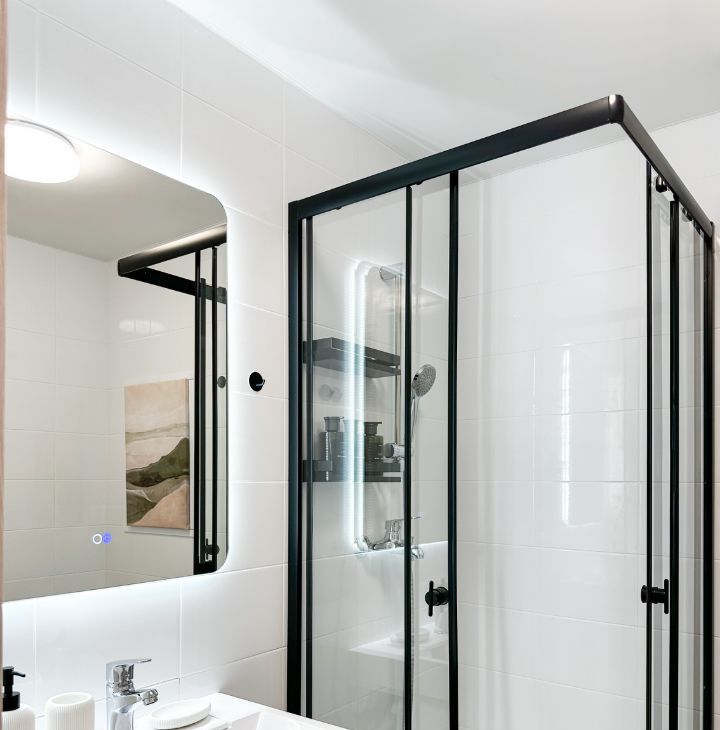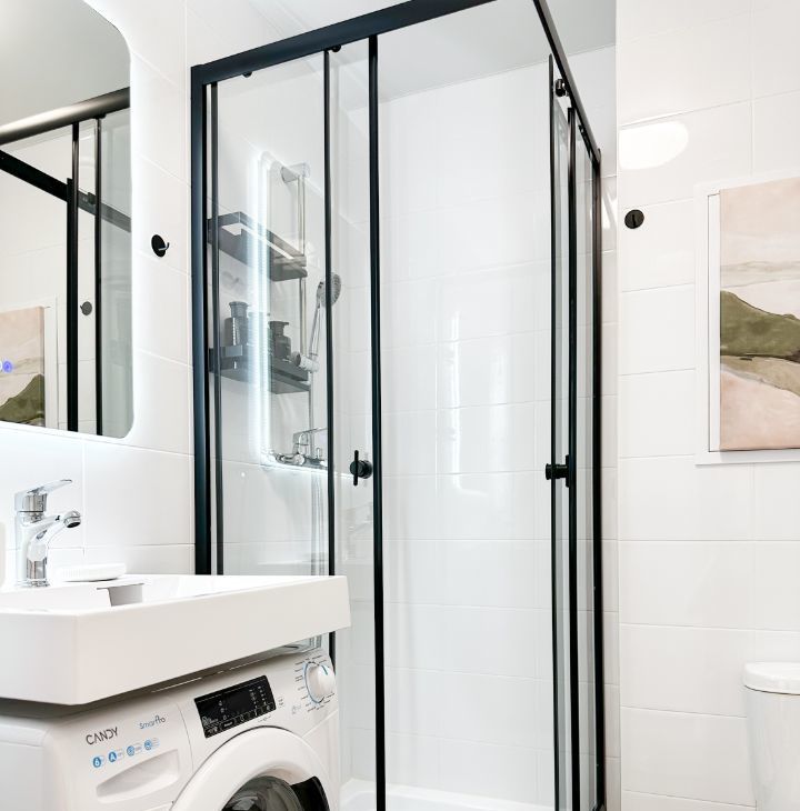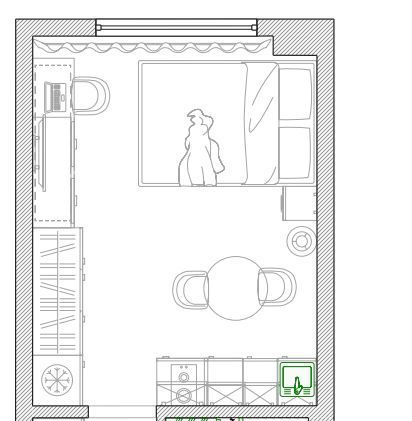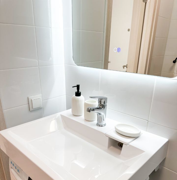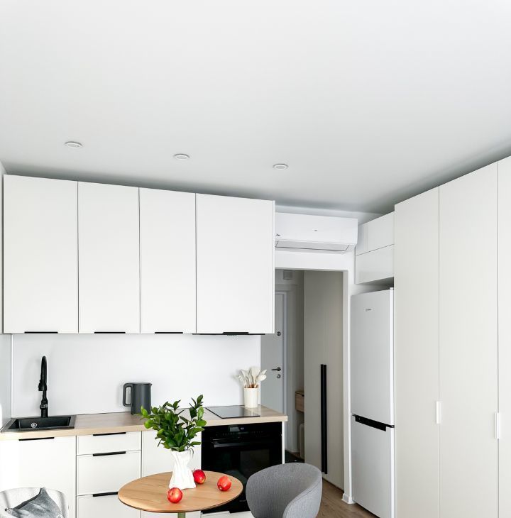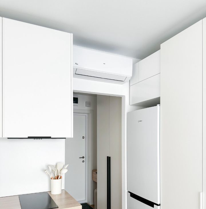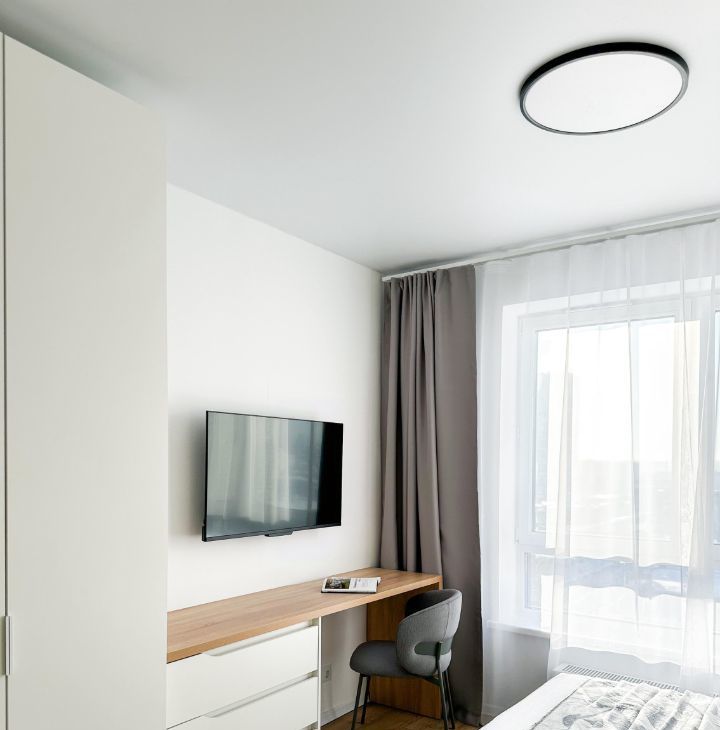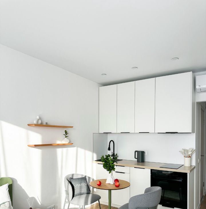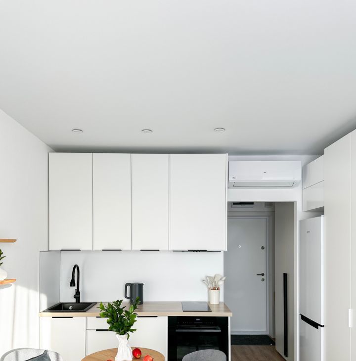 Бытовaя техника: стиральная машина, холодильник, духовой шкаф с функцией СВЧ, варочная панель, утюг, электрический чайник, телевизор, кондиционер.