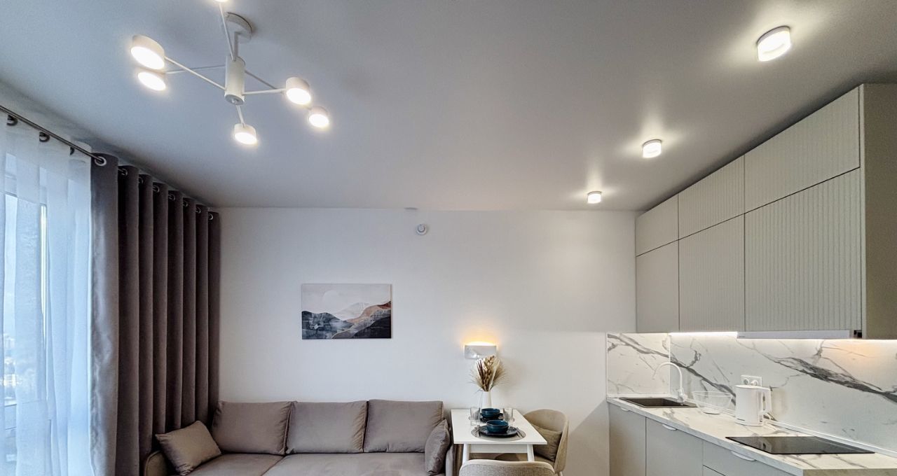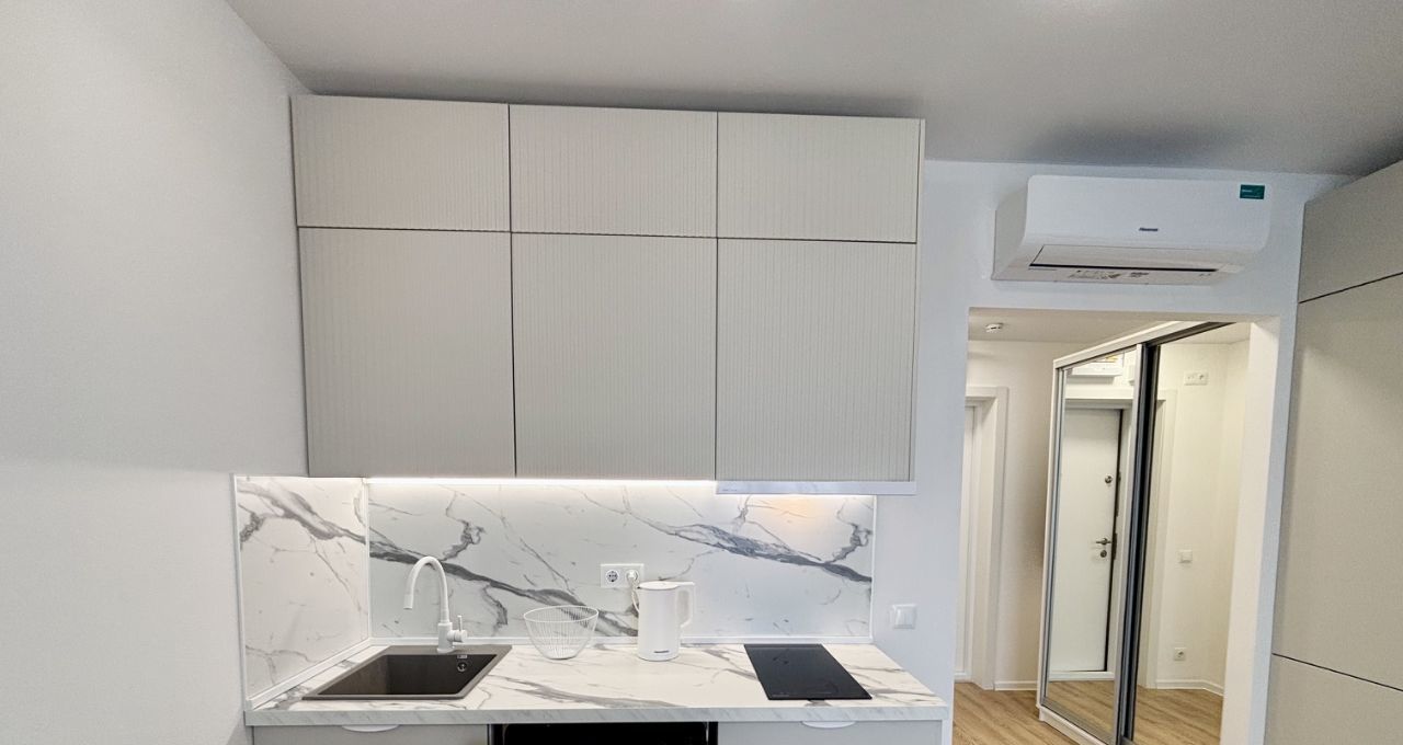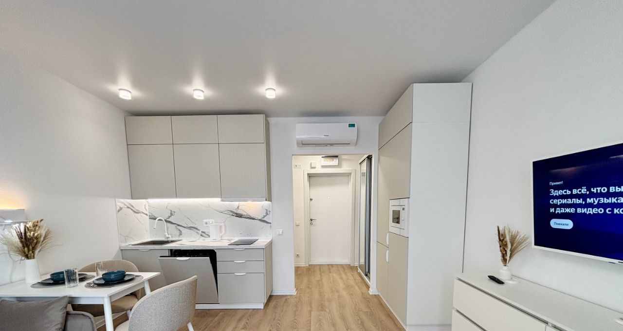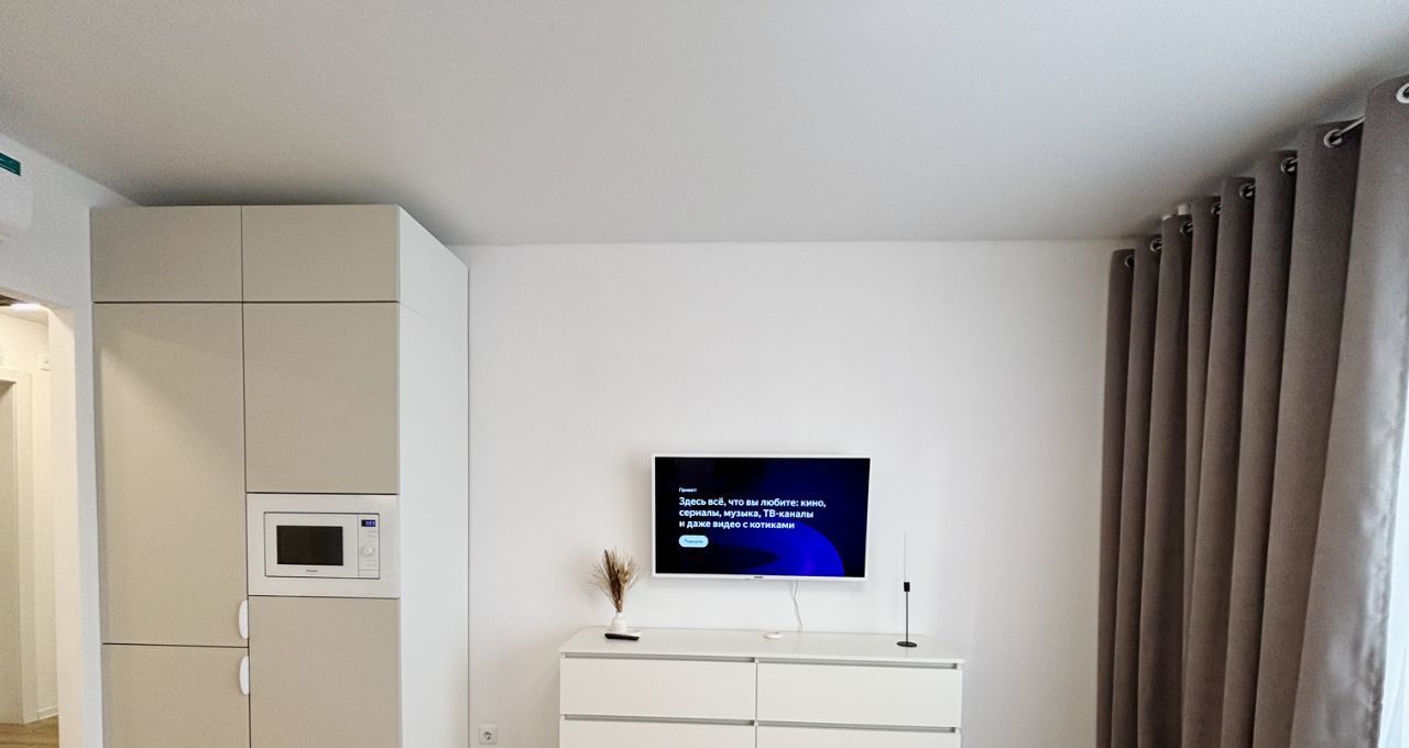 Оборудованная ТВ-зона. В квартире-студии установлен кондиционер, будет комфортно в любую погоду. Много места для хранения ваших вещей.