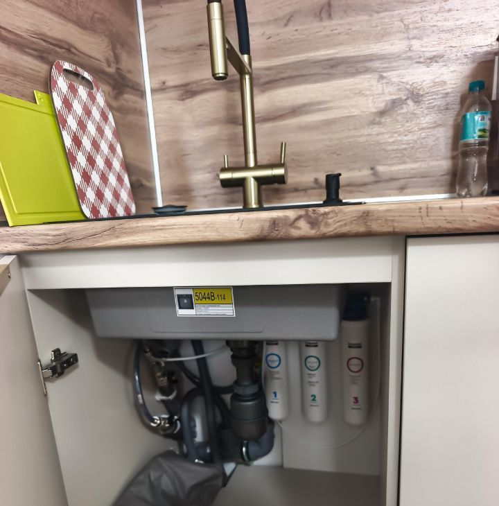 Кухня: Посудомоечная машина, индукционная варочная панель, фильтр питьевой воды, микроволновка, кофемашина и необходимая посуда.
