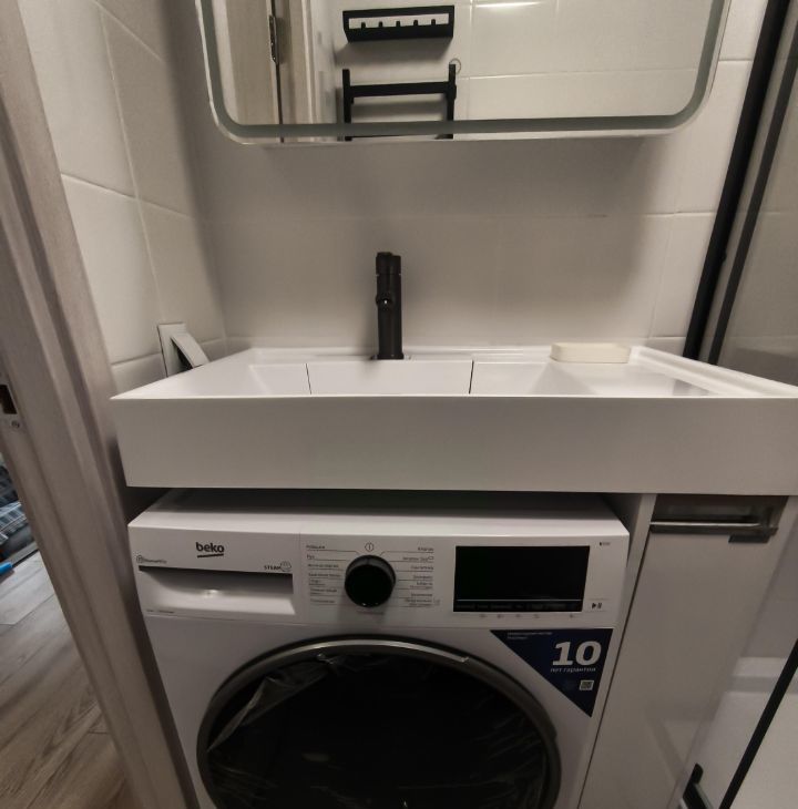 Ванная: Стиральная машина с функцией пара и электрический полотенцесушитель для вашего удобства.