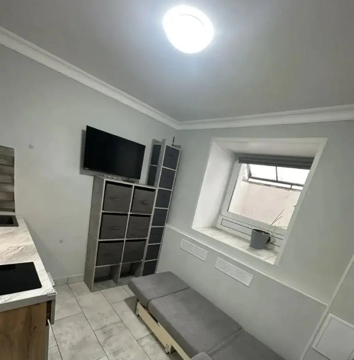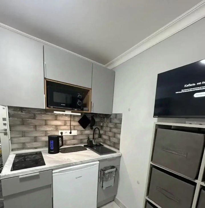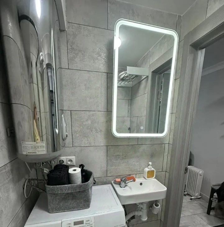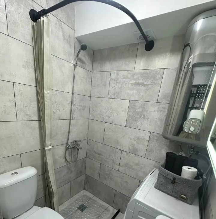 - в помещении всё есть: кухонный гарнитур, холодильник, микроволновая печь, плита, раковина шкаф, диван, стиральная машинка, душ, унитаз, раковина,