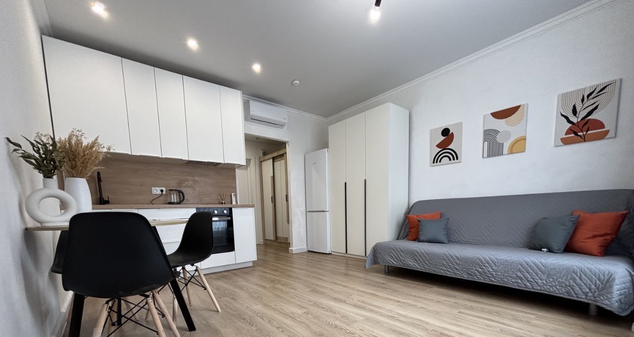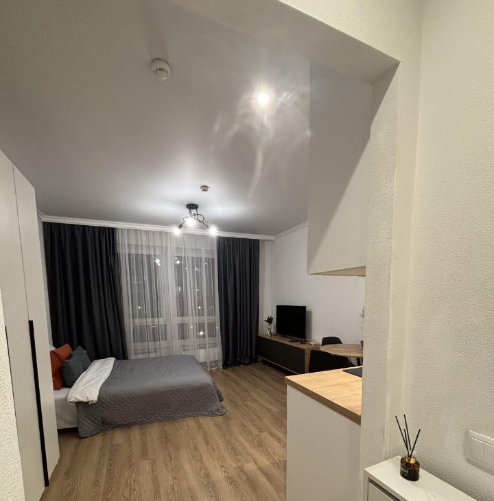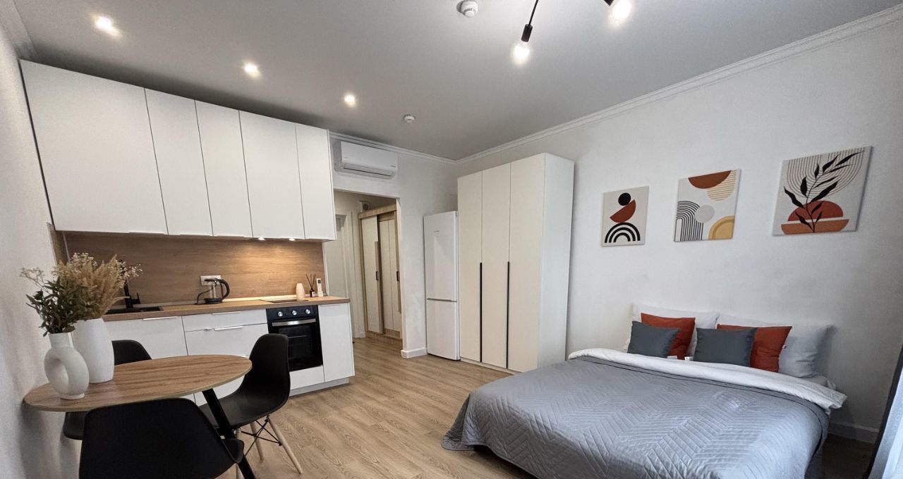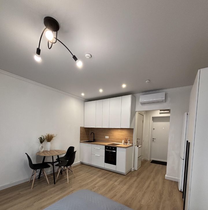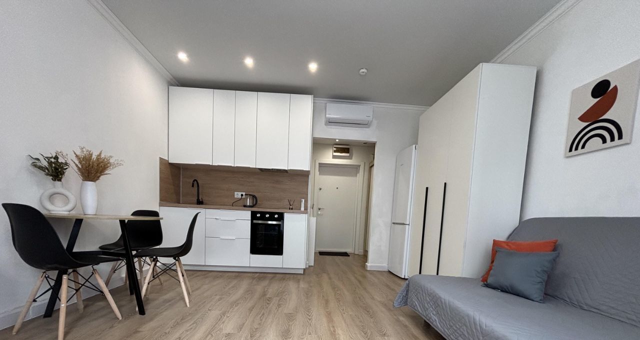 Студия с дизайнерским ремонтом, где каждая деталь продумана до мелочей. Пространство организовано максимально функционально, что делает квартиру комфортной для проживания. В квартире есть вся необходимая мебель и техника, поэтому можно сразу заехать и жить. Санузел совмещенный, выполнен в современном стиле.