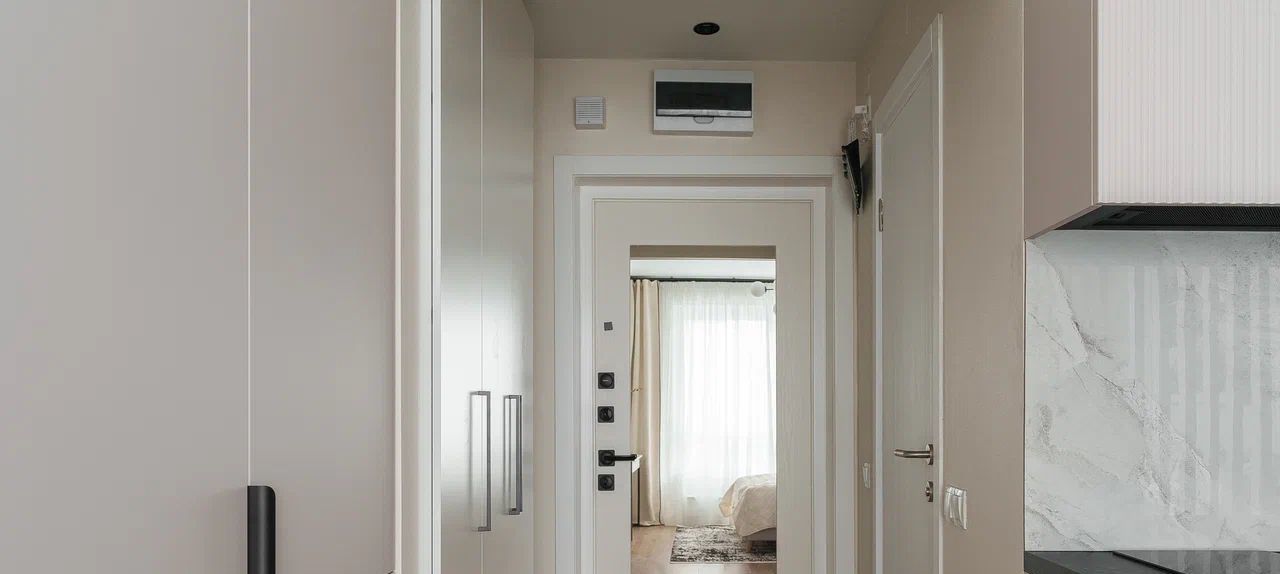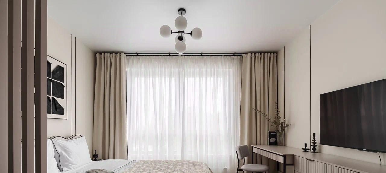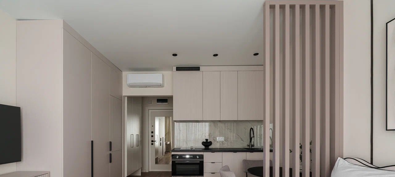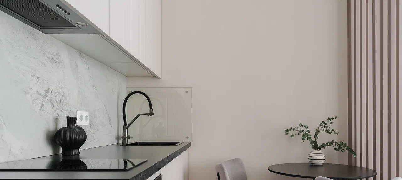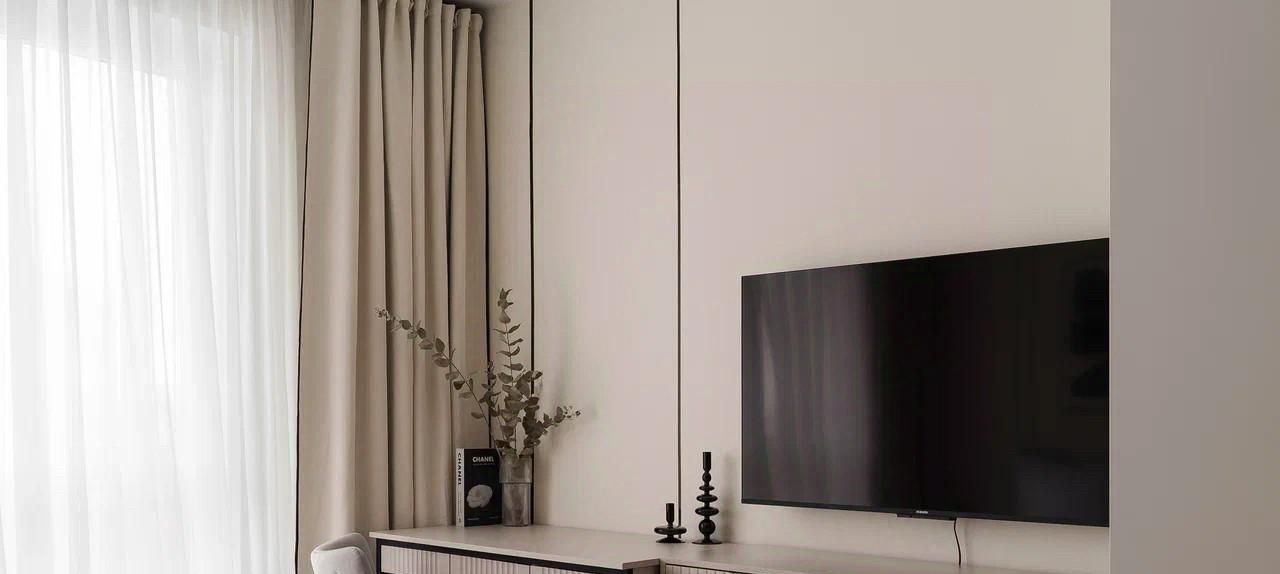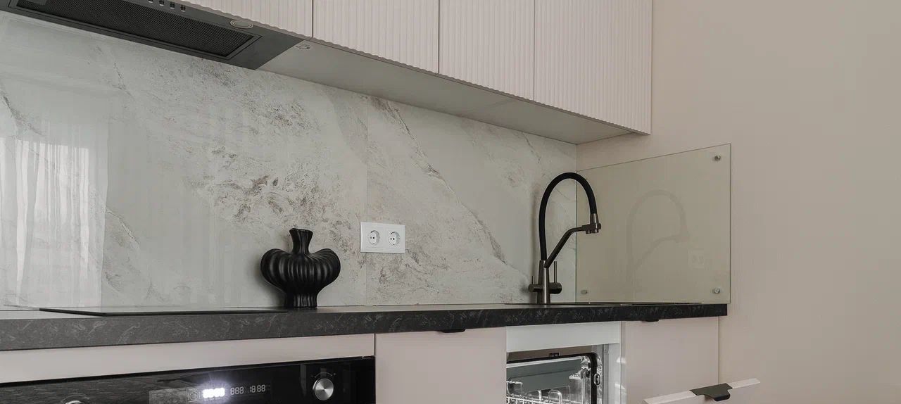 Кухня оборудована всей необходимой техникой, посудомоечная машина, духовой шкаф с функцией свч, варочная панель, фильтр питьевой воды. Также в квартире предусмотрено светлое рабочее место, тв с диагональю 50