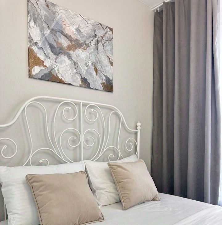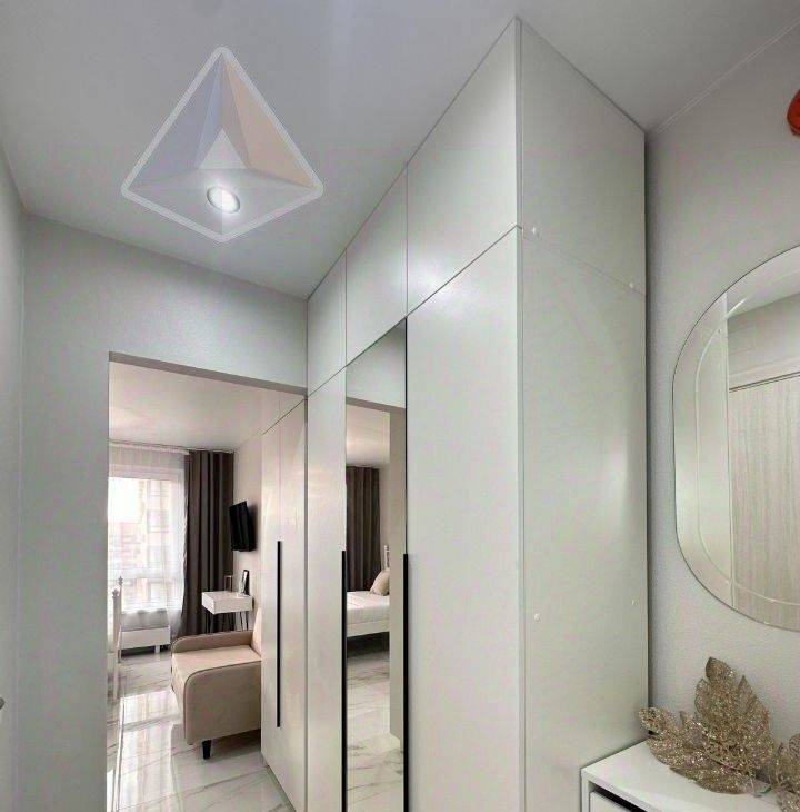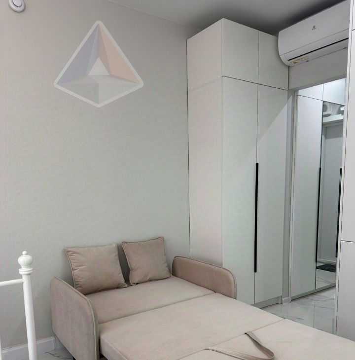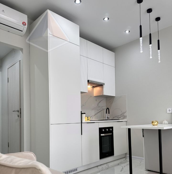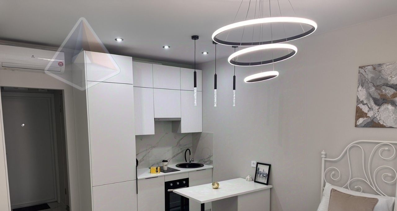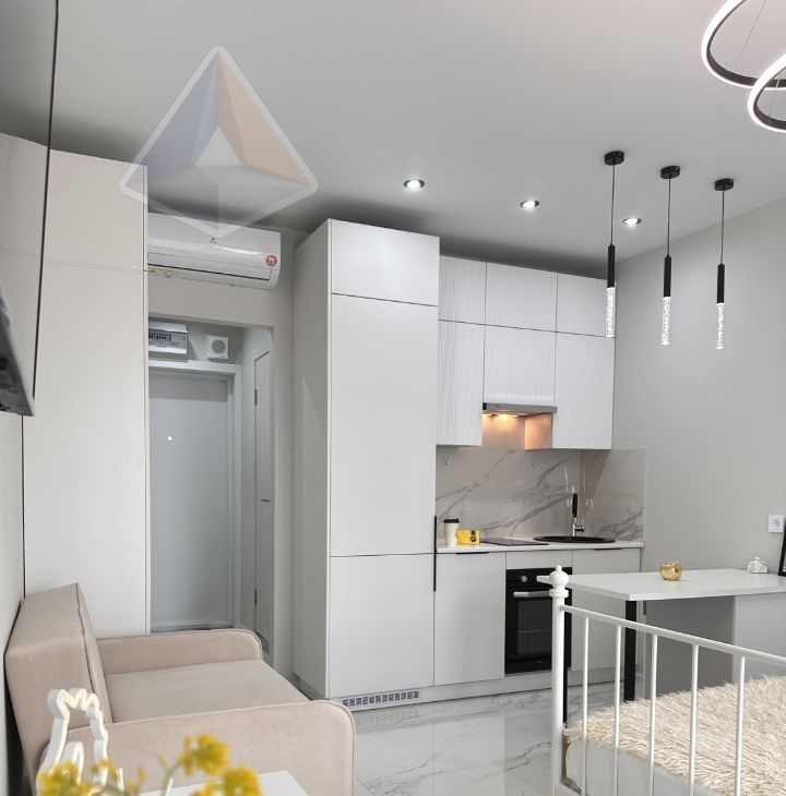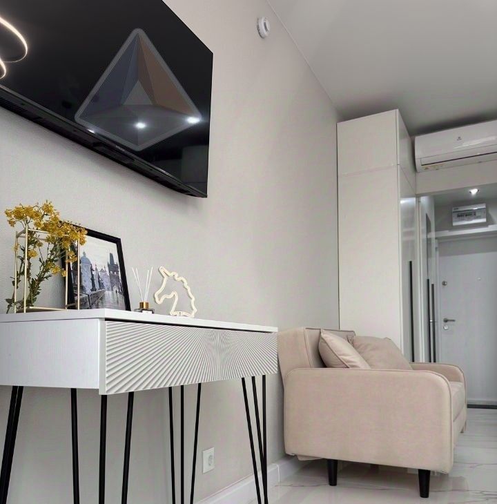 В студии выполнен продуманный дизайнерский ремонт: на полу уложен широкоформатный керамогранит, а душевая зона оснащена терморегуляцией и поддоном из керамогранита. Внутри есть всё необходимое для комфортного проживания: двуспальная кровать с ортопедическим матрасом и диван, который раскладывается в полноценное двуспальное место. Для приготовления еды предусмотрены холодильник, посудомоечная и стиральная машины, индукционная плита и чайник. Кондиционер с функцией ночного режима обеспечит комфортный микроклимат в любое время года.