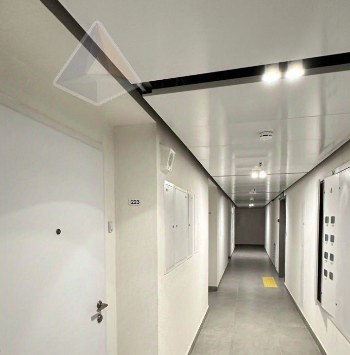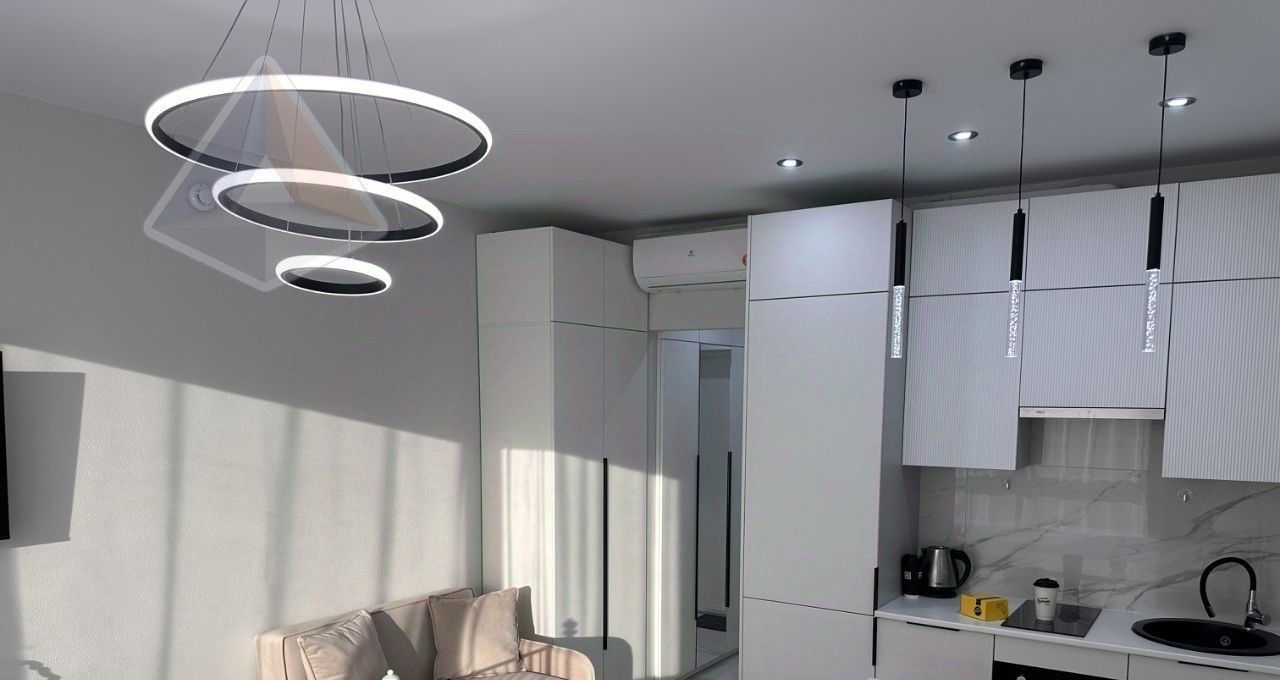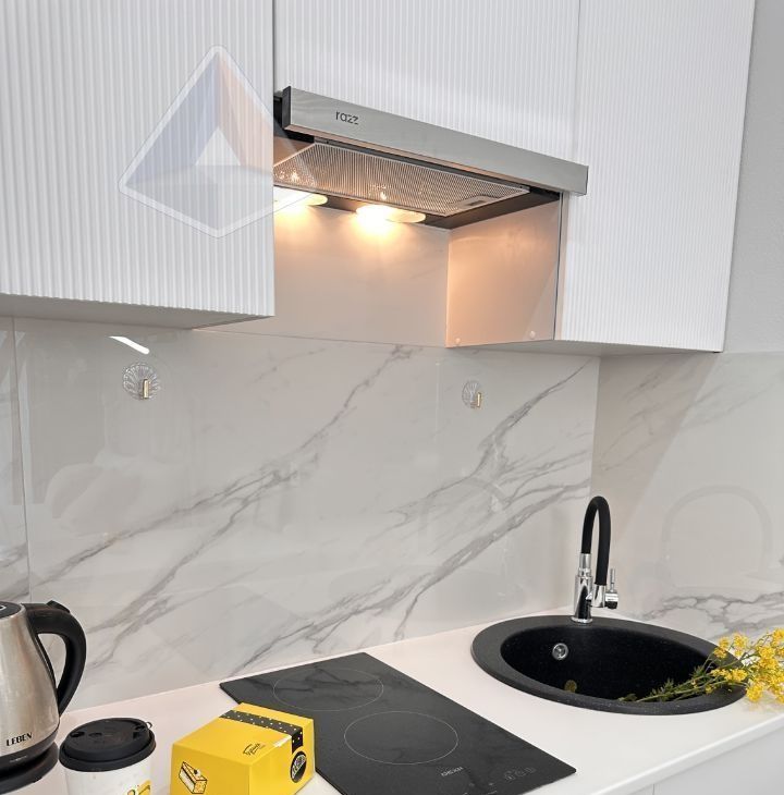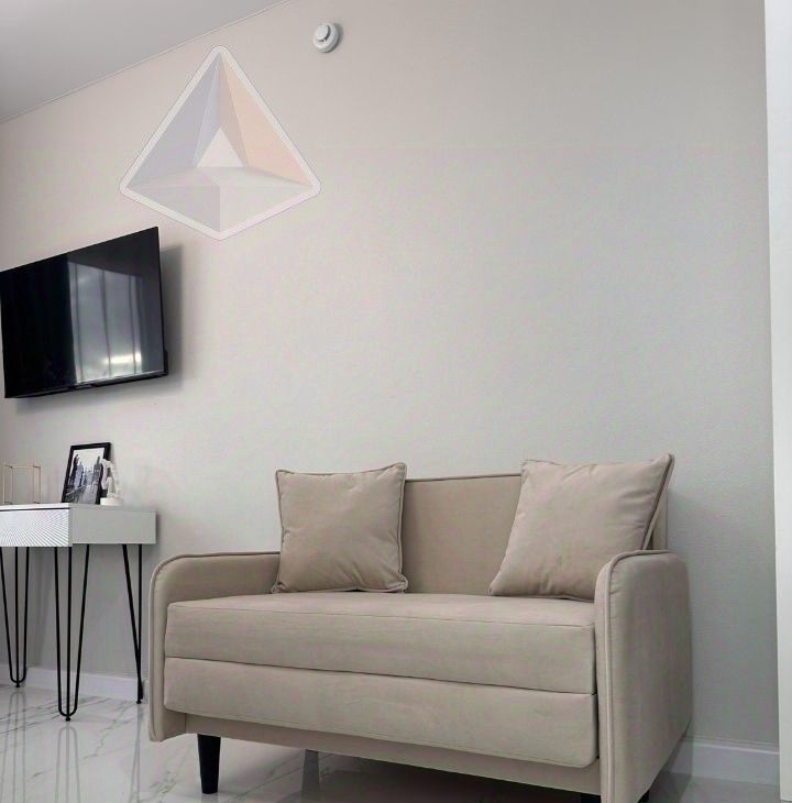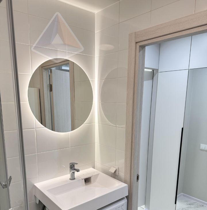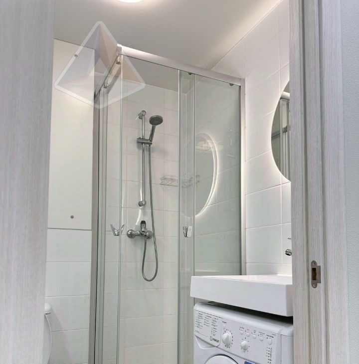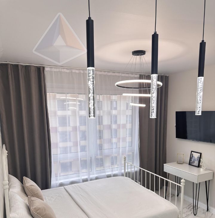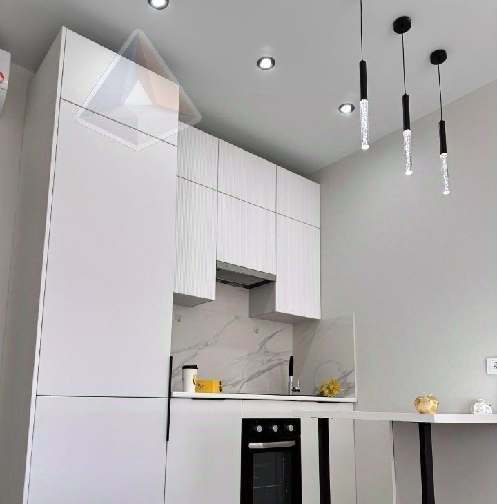 В студии выполнен продуманный дизайнерский ремонт: на полу уложен широкоформатный керамогранит, а душевая зона оснащена терморегуляцией и поддоном из керамогранита. Внутри есть всё необходимое для комфортного проживания: двуспальная кровать с ортопедическим матрасом и диван, который раскладывается в полноценное двуспальное место. Для приготовления еды предусмотрены холодильник, посудомоечная и стиральная машины, индукционная плита и чайник. Кондиционер с функцией ночного режима обеспечит комфортный микроклимат в любое время года.