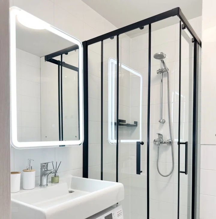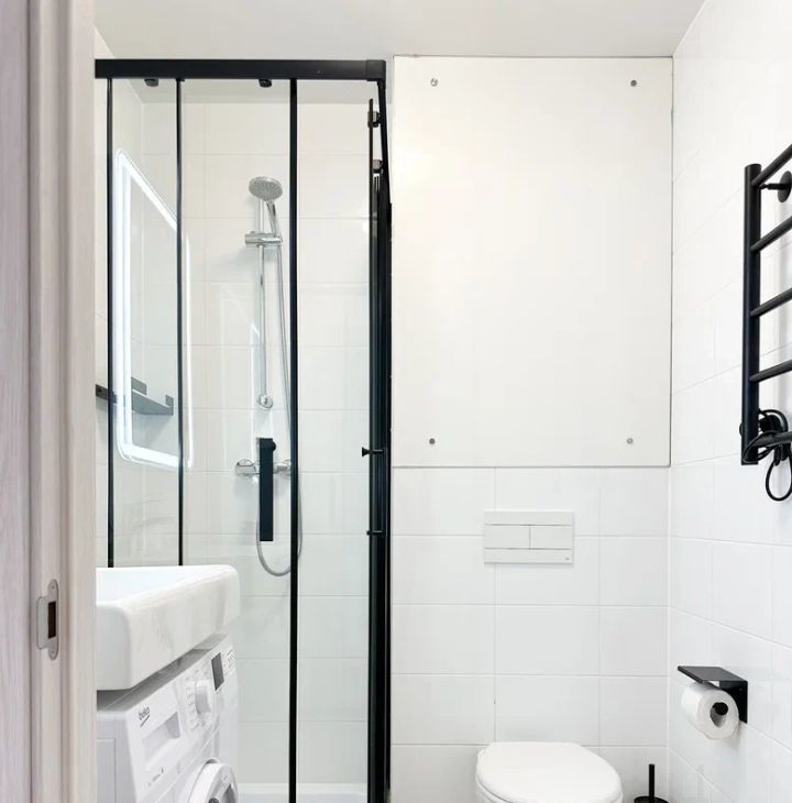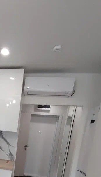Бытовая техника: кондиционер, стиральная машина, утюг, холодильник, встроенная СВЧ печь, варочная панель, вытяжка.