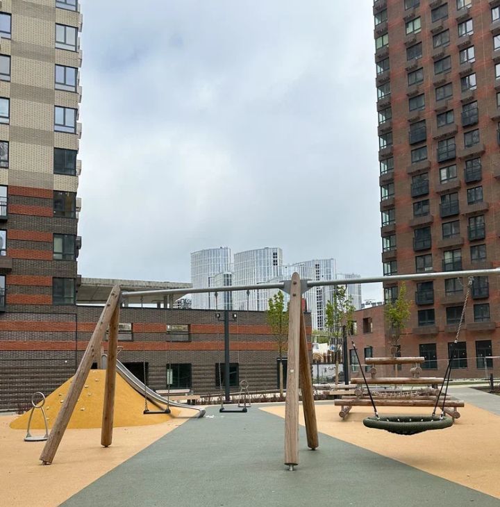 Внутри двора беседки со скамейками, тренажёры, место для прогулки.