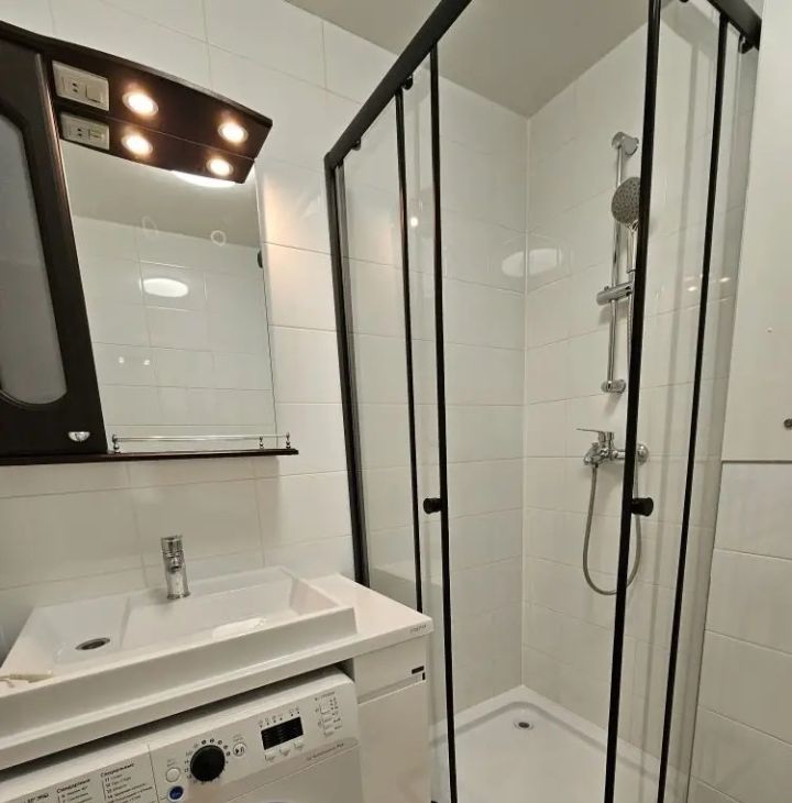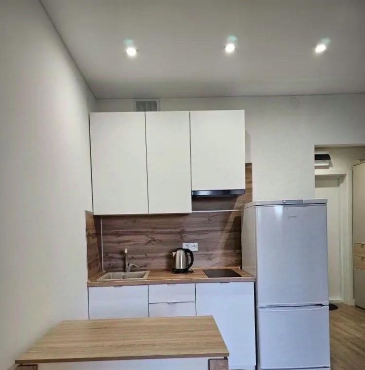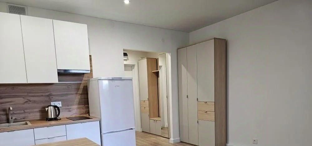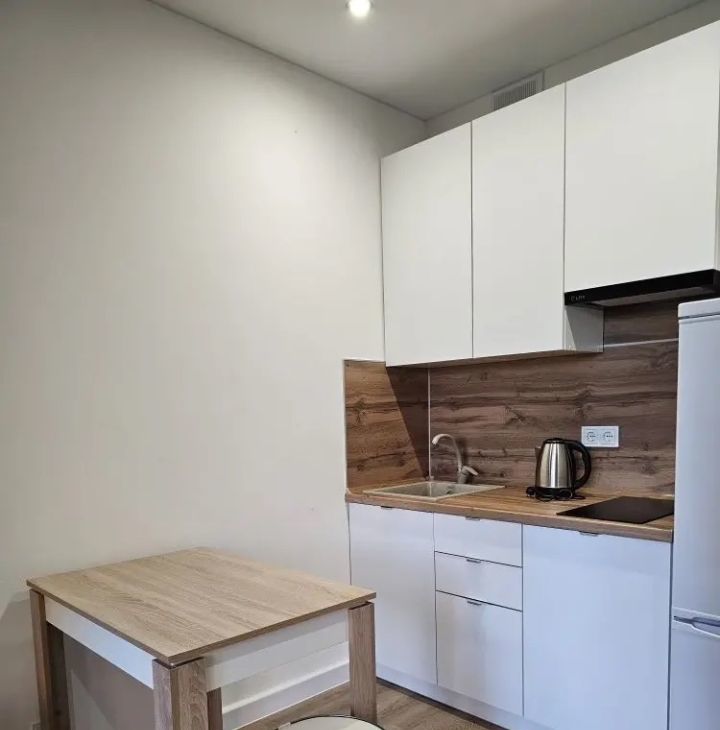 В квартире сделан евроремонт, что создает атмосферу уюта и современности. Пространство студии грамотно организовано: есть мебель на кухне и в комнате, установлена необходимая техника — холодильник, телевизор и стиральная машина. Санузел совмещенный, оборудован душевой кабиной.