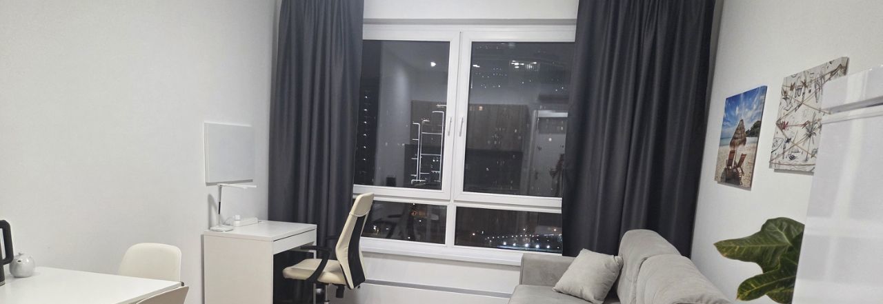 В 2-х минутах ходьбы от станции метро "Аминьевская" сдается на длительный срок в аренду чистая, уютная, светлая, видовая однокомнатная квартира студия на ул. Очаковское шоссе д. 5 на 18 этаже 33-этажного дома с отличными видовыми характеристиками (skyline view) и спокойными соседями. Квартира сдается в первый раз! Полностью упакованная (евроремонт, раскладывающийся диван ASKONA, SMART телевизор, рабочее место, интернет, встроенный кухонный гарнитур, двухкамерный холодильник, посуда, душевой уголок, стиральная машина, кондиционер, микроволновая печь, чайник, ковер и т.д.). Благоустроенный чистый двор, на первом этаже сетевые продуктовые магазины, аптеки, кафе и рестораны. Фото реальные. Возможен небольшой торг. Отдам предпочтение порядочным людям без животных, семейным парам.