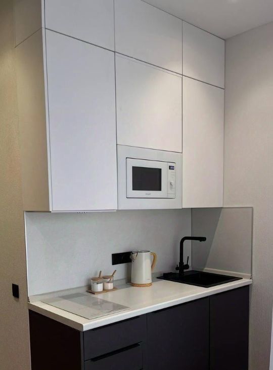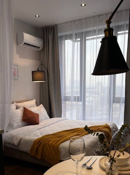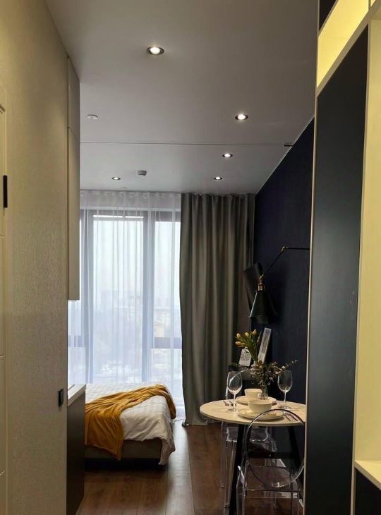 В студии есть все необходимое для комфортного проживания: кондиционер, холодильник, телевизор и стиральная машина. Мебель установлена как в комнате, так и на кухне. Ванная комната оборудована современной душевой кабиной. Окна выходят во двор, что обеспечивает тишину и спокойствие.