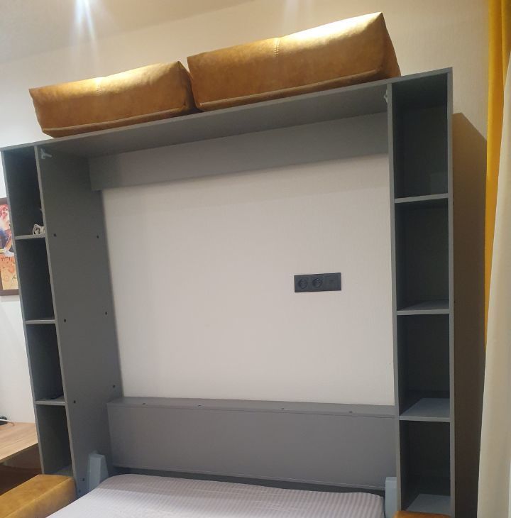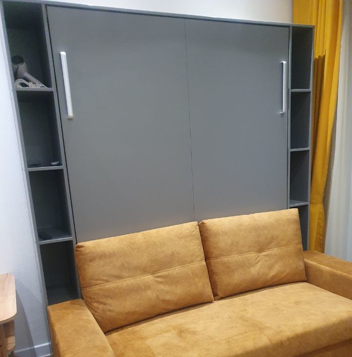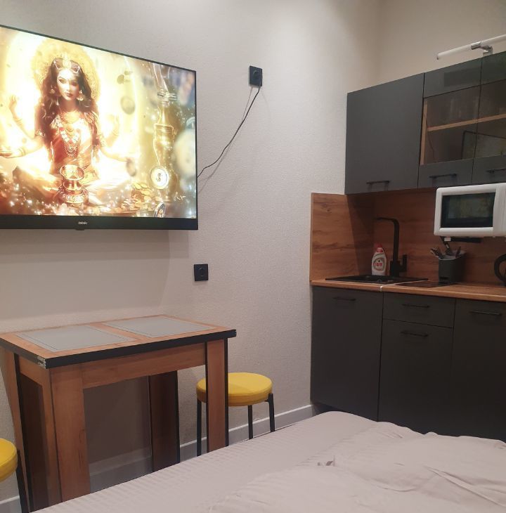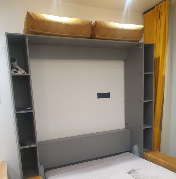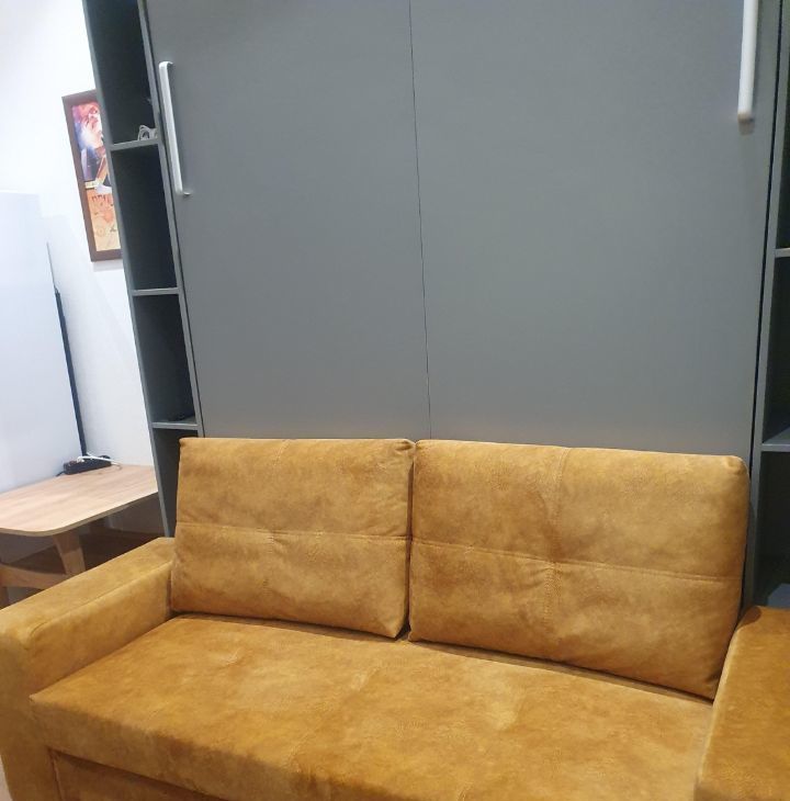 Wi-Fi интернет(500Мбит/сек), Шкаф-кровать-диван,ортопедический матрас,шкаф-прихожая, кухонный стол трансформер, кухня, журнальный столик, стиральная машина, холодильник (no frost), телевизор 50" (смарт ТВ), стекло- керамическая плита, СВЧ микроволновая печь, электрический чайник. Посуда. Постельное белье. Полотенца.