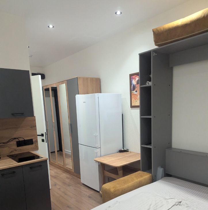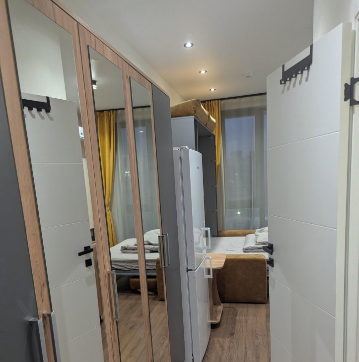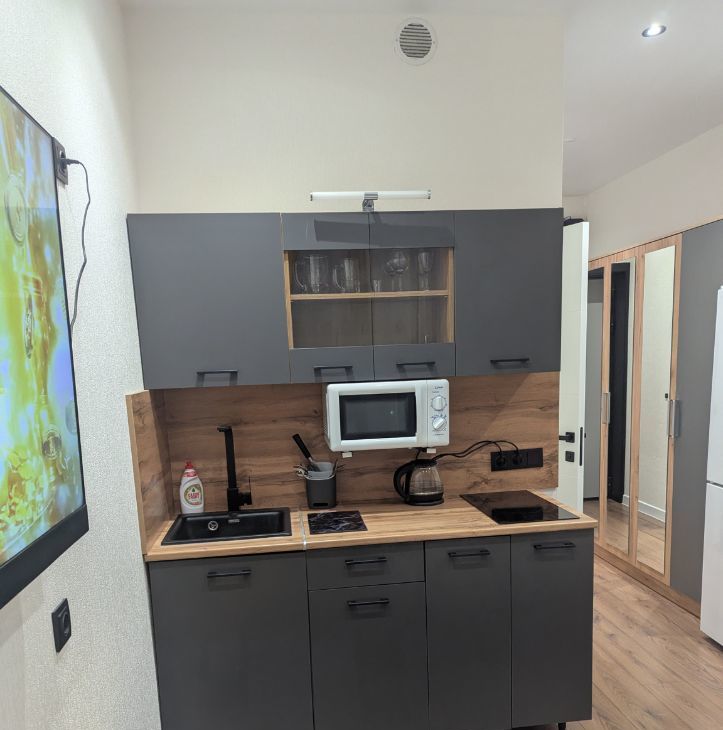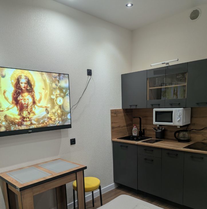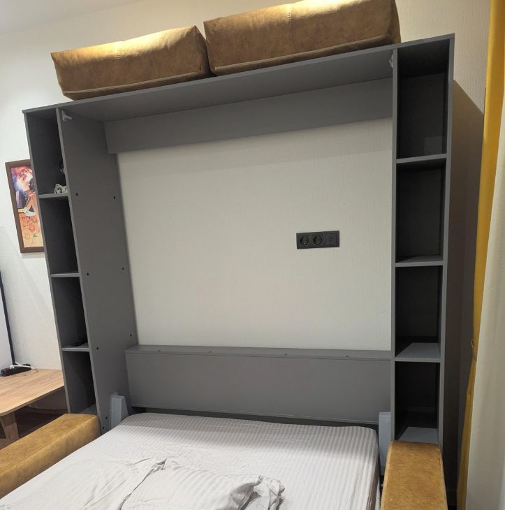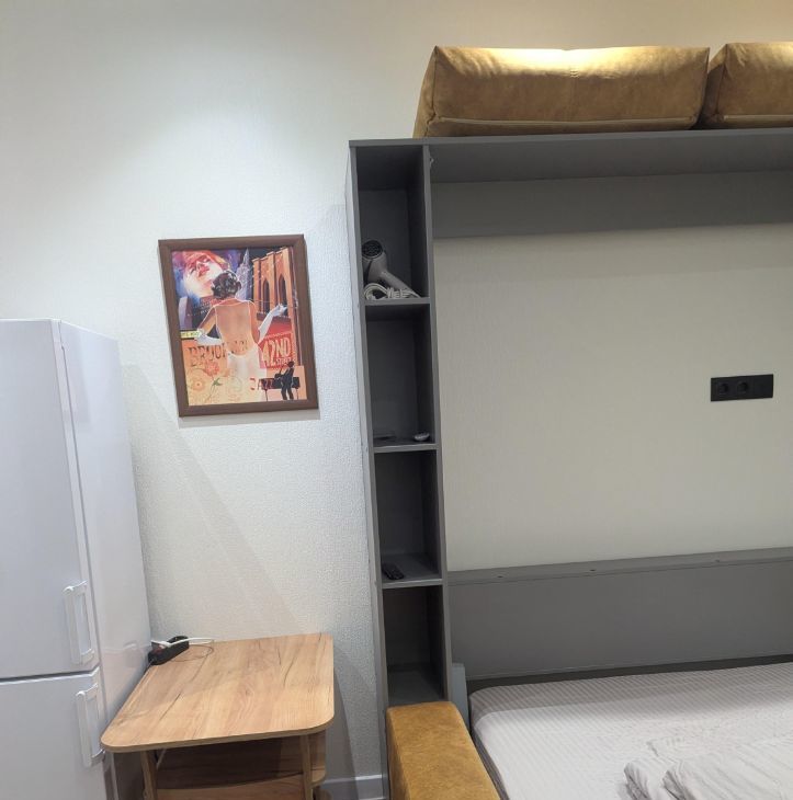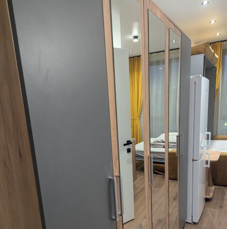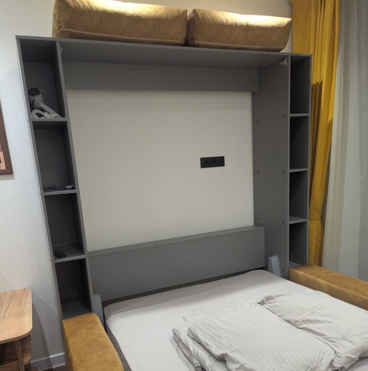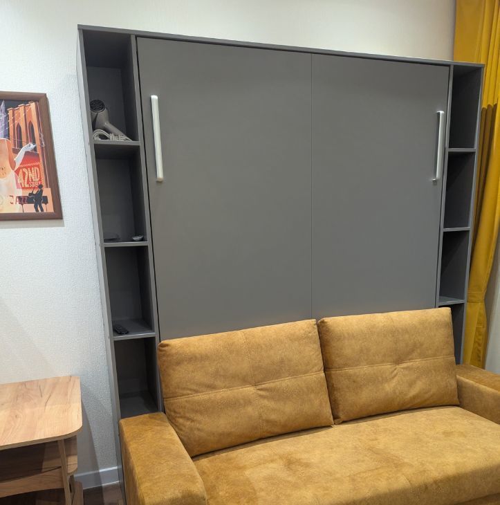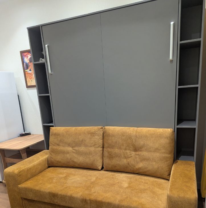 Шкаф-кровать-диван,ортопедический матрас,шкаф-прихожая, кухонный стол трансформер, кухня, журнальный столик, стиральная машина, холодильник (no frost), телевизор 50" (смарт ТВ), стекло- керамическая плита, СВЧ микроволновая печь.