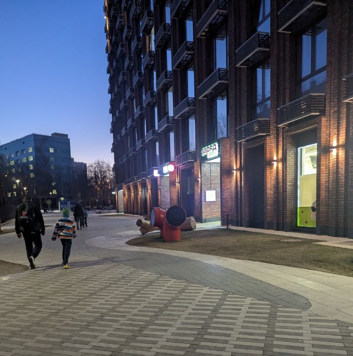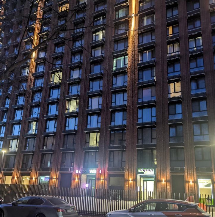 В доме расположен ПВЗ Озон, Weldberris, Продуктовый магазин "Заряд" от Магнита и Детская футбольная школа.