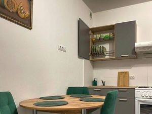 В студии есть всё необходимое для вашего удобства: кондиционер, холодильник, посудомоечная и стиральная машины, а также телевизор. Мебель на кухне и в комнате делает пространство функциональным и уютным.