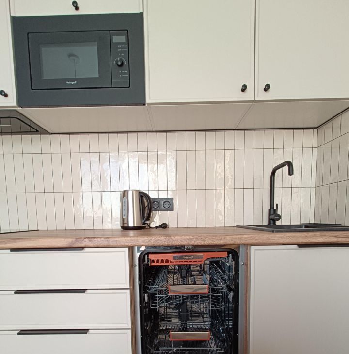 Всё для жизни - уютная кухня с посудой, микроволновкой и посудомоечной машиной.