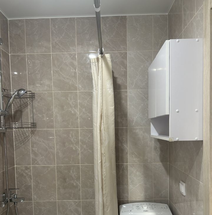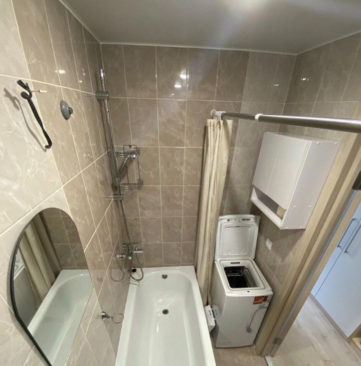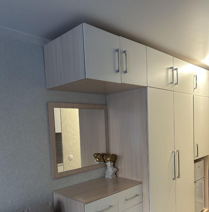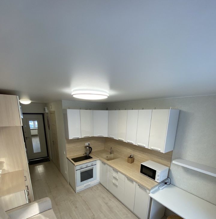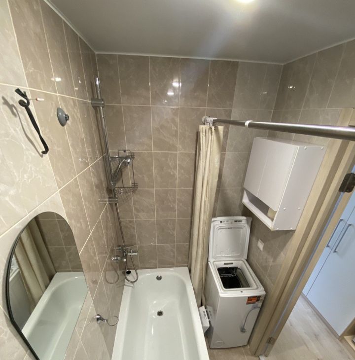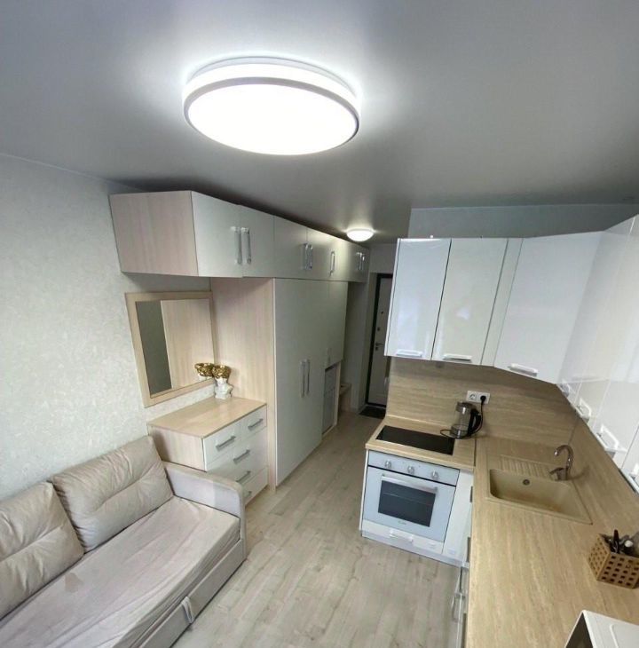 Сдаётся светлая уютная студия с видом во двор. Жильё оборудовано всей необходимой техникой: кухонным гарнитуром с духовкой, электрочайником, микроволновкой, холодильником с морозилкой, кондиционером, стиральной машинкой. Имеется вся необходимая мебель: двуспальный диван, вместительный шкаф для хранения, большой рабочий стол, комод, навесные полочки. В ванной комнате есть ванна с экраном для хранения бытовой химии, полотенцесушитель, навесной шкаф и навесная раскладывающаяся сушилка