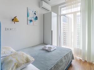 Квартира располагает кроватью с подьемным механизмом и большой зоной хранения, в кухонной зоне установлена индукционная варочная панель, в санузел стиральная машина с функцией сушильной.