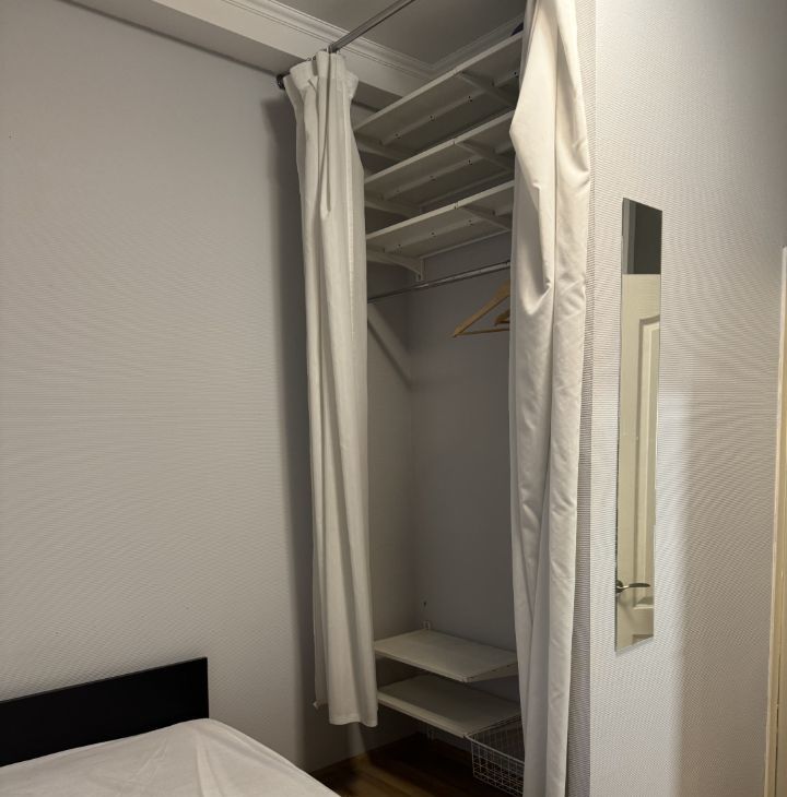 Мебель: всё необходимое для комфортного проживания (кровать, шкаф, холодильник,телевизор, стиральная машина, интернет, имеется удобная кладовка)