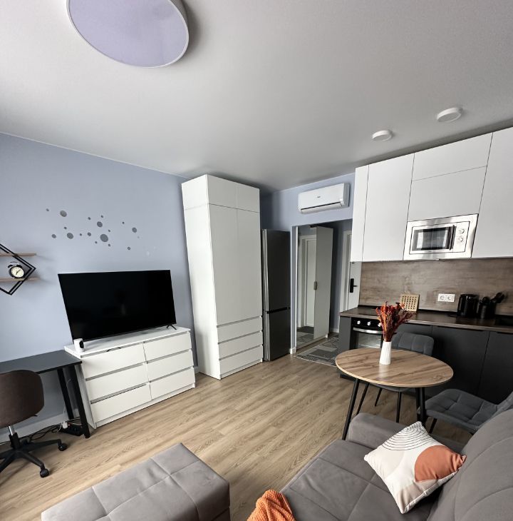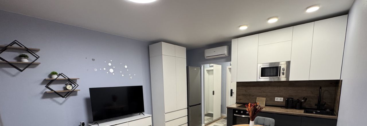 В квартире сделан качественный евроремонт, поэтому вы сможете сразу же наслаждаться комфортом и уютом. Пространство студии грамотно организовано В ванной комнате установлена душевая кабина, произведена замена сантехники от застройщика на качественную. Для вашего удобства в квартире есть вся необходимая техника: кондиционер, холодильник, телевизор 50 дюймов, посудомоечная и стиральная машины, микроволновая печь, духовой шкаф, индукционная керамическая плита, пылесос.