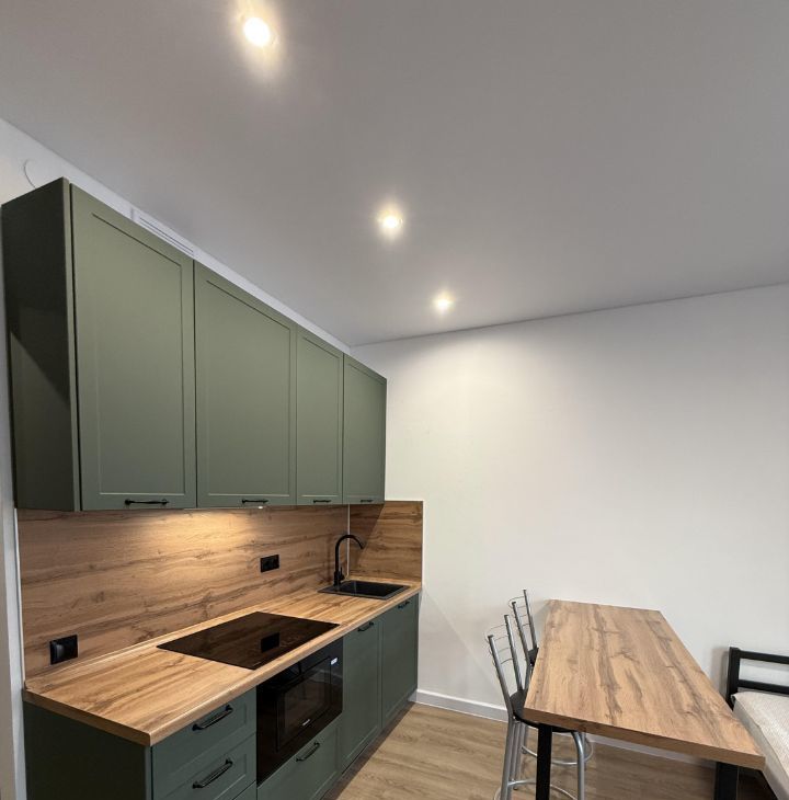 В зоне кухни расположен кухонный гарнитур со встроенной индукционной варочной панелью, микроволновой печью, посудомоечной машиной и подсветкой. Кухня отделена от спальной зоны барной стойкой.