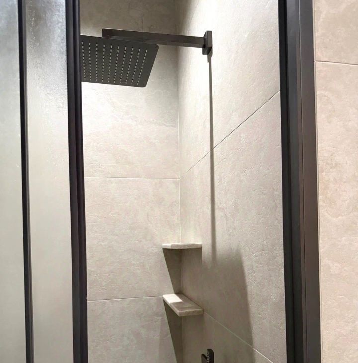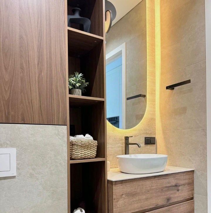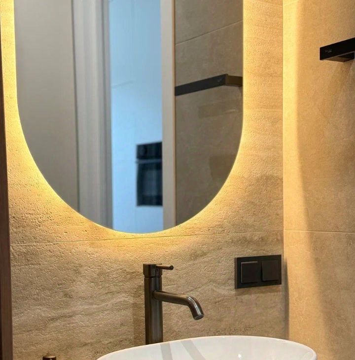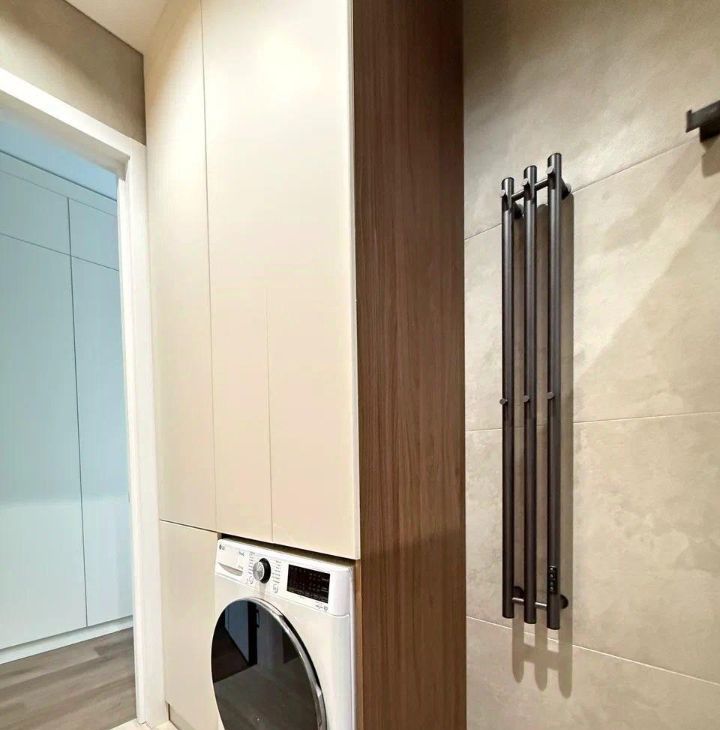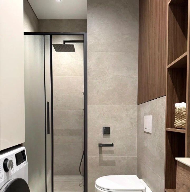 Просторная ванная комната — 5 м² с продуманными системами хранения, большой душевой, стирально-сушильной машиной LG и зеркалом с подсветкой. Трубы Rehau.
