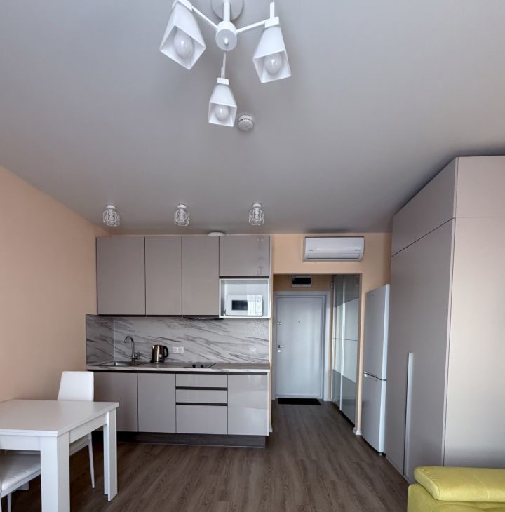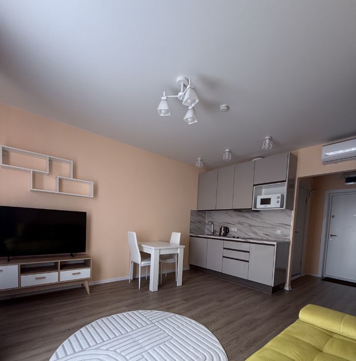 Впервые в долгосрочную аренду сдаётся уютная, светлая квартира-студия с хорошим новым ремонтом. Вся мебель новая, текстиль, постельное бельё, посуда и кухонные принадлежности, удобный диван в гостиной, обеденная группа, столик и два обеденных стула. В квартире есть вся необходимая техника для комфортного проживания: телевизор, микроволновая печь, духовой шкаф, плита, чайник, фен, стиральная машина, утюг, гладильная доска, сушилка, пылесос , кондиционер , интернет . Новое постельное белье, полотенца, подушка, плед, столовые принадлежности, посуда, кастрюли, сковороды, разделочные доски.
