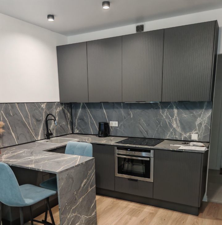 Кухня: Холодильник, электрическая плита, вытяжка, ПРЕМИАЛЬНЫЙ духовой шкаф NEFF с функцией микроволновой печи, чайник,фильтр для воды с обратным осмосом