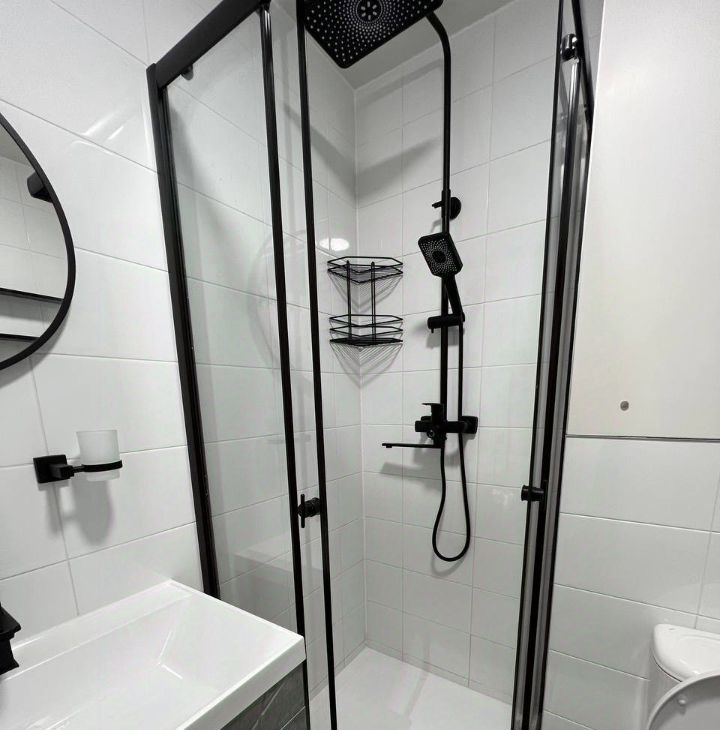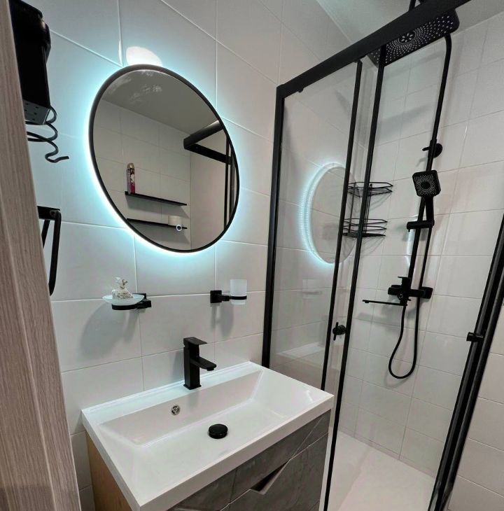 в ванной комнате: душевая с перегородками и каменным поддоном, система с тропическим душем, все смесители FRAP.