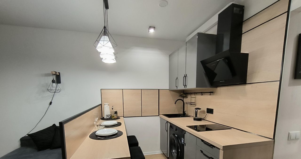 кухня с необходимой техникой (холодильник, плита, духовка с грилем , вытяжка, чайник, посуда, стиральная машина, микроволновка). Посуда luminark, столовые приборы, кастрюли, минимум столовой утвари