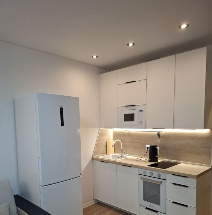 В квартире есть современная техника: встроенная микроволновка с грилем, духовой шкаф, индукционная варочная панель, посудомоечная машина, стиральная машина, холодильник с Wi-Fi, телевизор 55 со Smart TV, компактный пылесос.