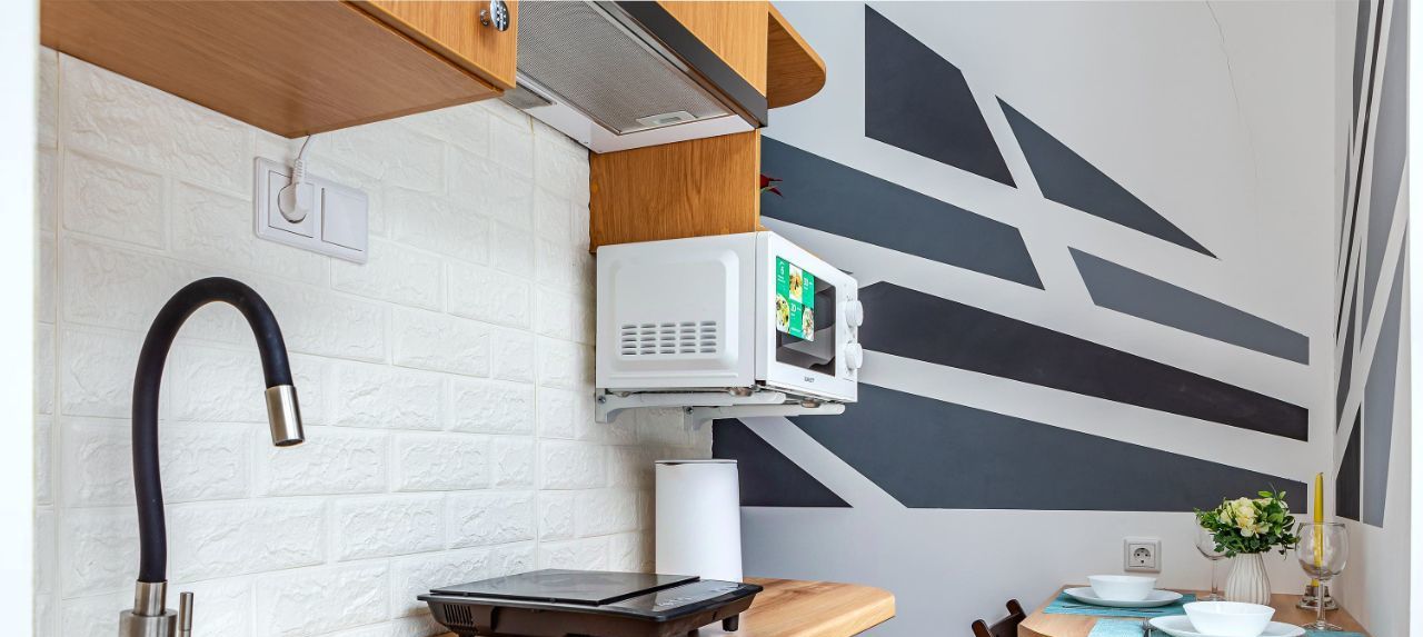 - Стильный кухонный гарнитур со всем необходимым для приготовления любимой домашней еды (индукционная плита, кухонные принадлежности, посуда, столовые приборы)