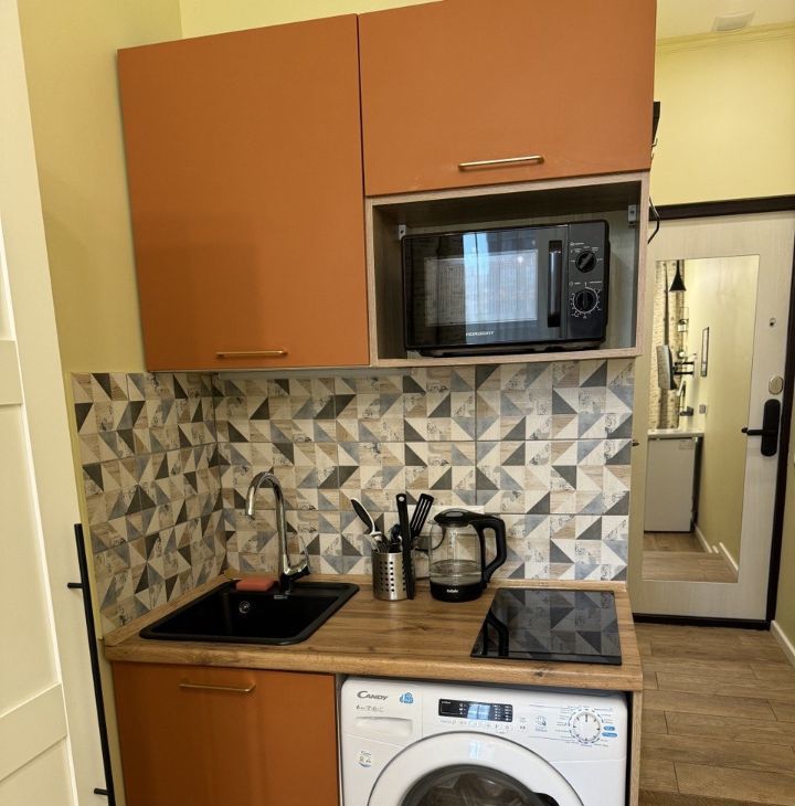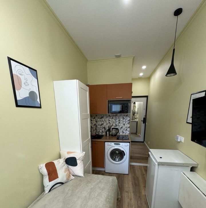 Сдаю студию в жк Silver на 4 этаже 7 этажного дома. В студии есть абсолютно все для комфортной жизни: посуда,холодильник с морозильной камерой, кровать 140 на 200 (на фото в сложенном виде 80 на 200) микроволновая печь, чайник,стиральная машина, шкаф.