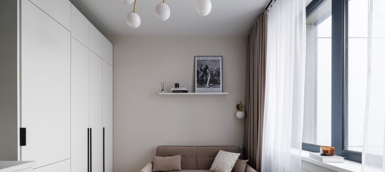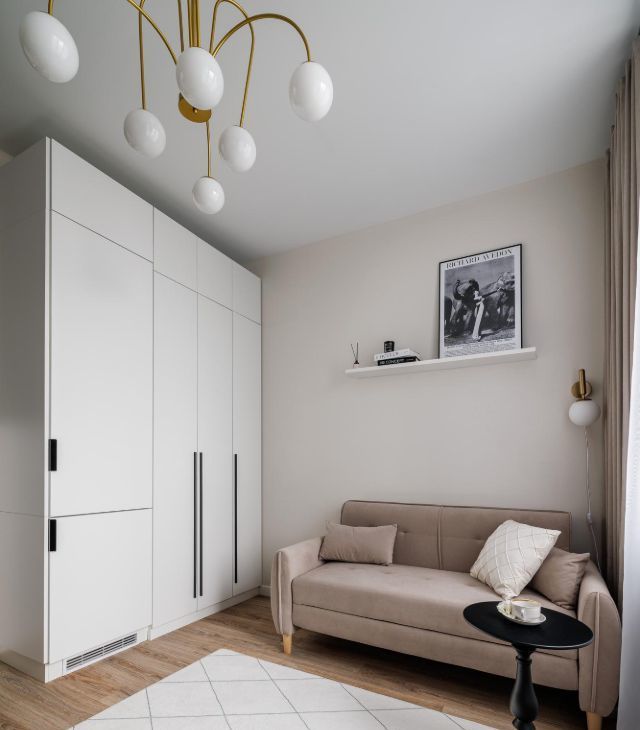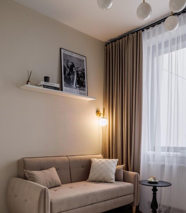 - большой шкаф, раскладной диван (ширина 140 см), рабочий стол - трансформер, кресло, журнальный стол, светильник, бра, текстиль (одеяло, подушки декоративные 3 шт., шторы, тюль)