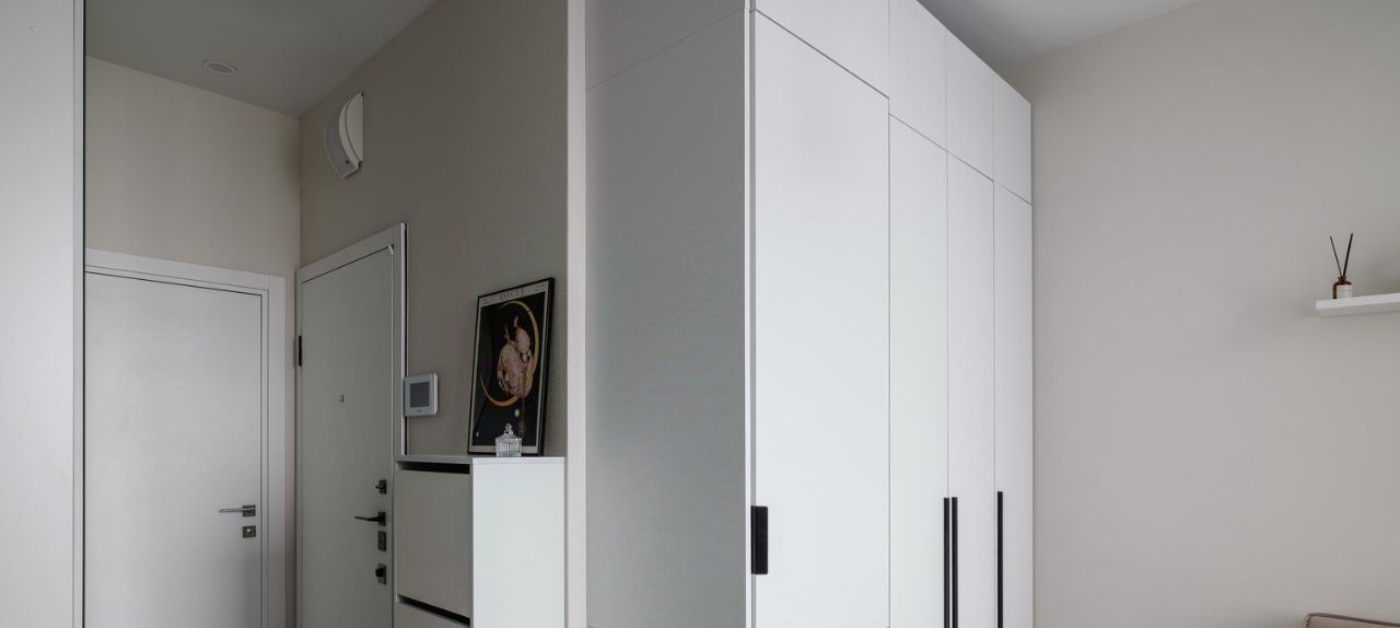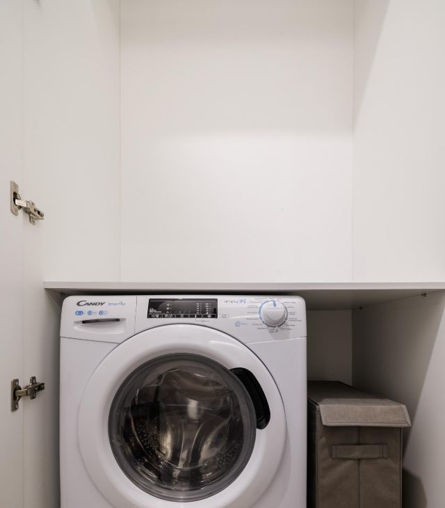 - большой шкаф, стиральная машина с функцией сушки, обувница, гладильная доска, корзина для хранения белья