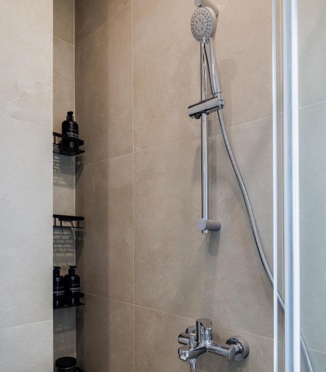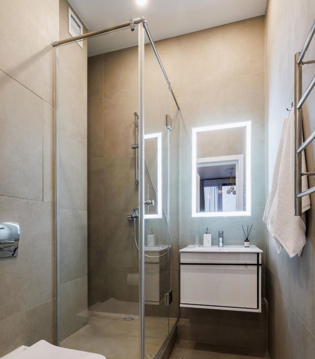 - зеркало-шкаф для хранения, тумба под раковину с хранением, душевая кабина, унитаз, полотенцесушитель, полотенца