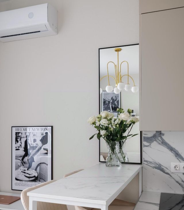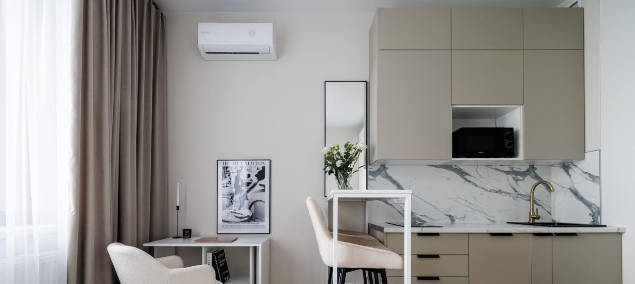 - встроенный кухонный гарнитур, посудомойка, большой холодильник, электрическая плита, вытяжка, СВЧ, барные стулья с поворотным механизмом, электрический чайник, кондиционер с низким уровнем шума и режимом самоочистки