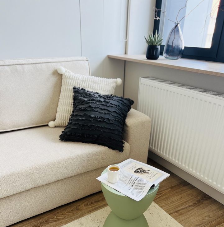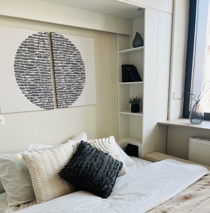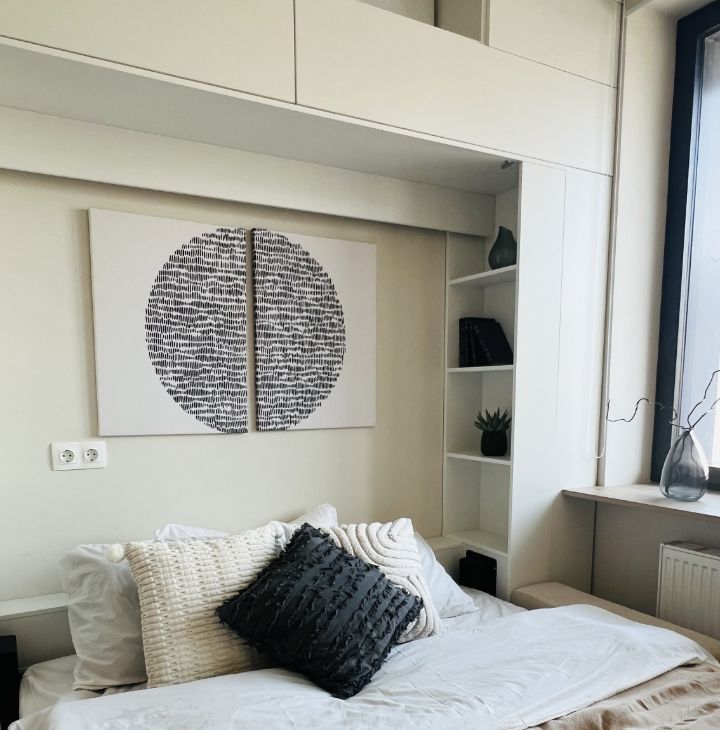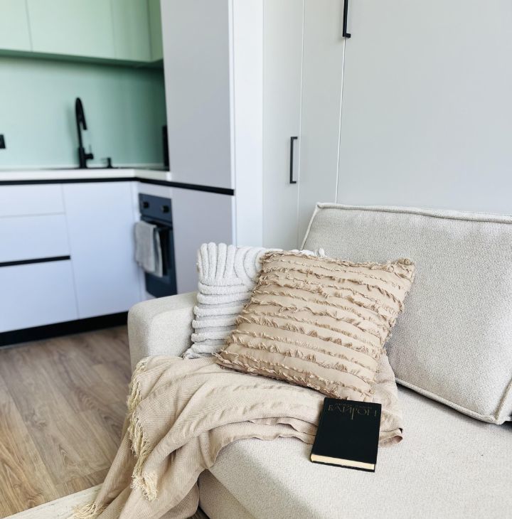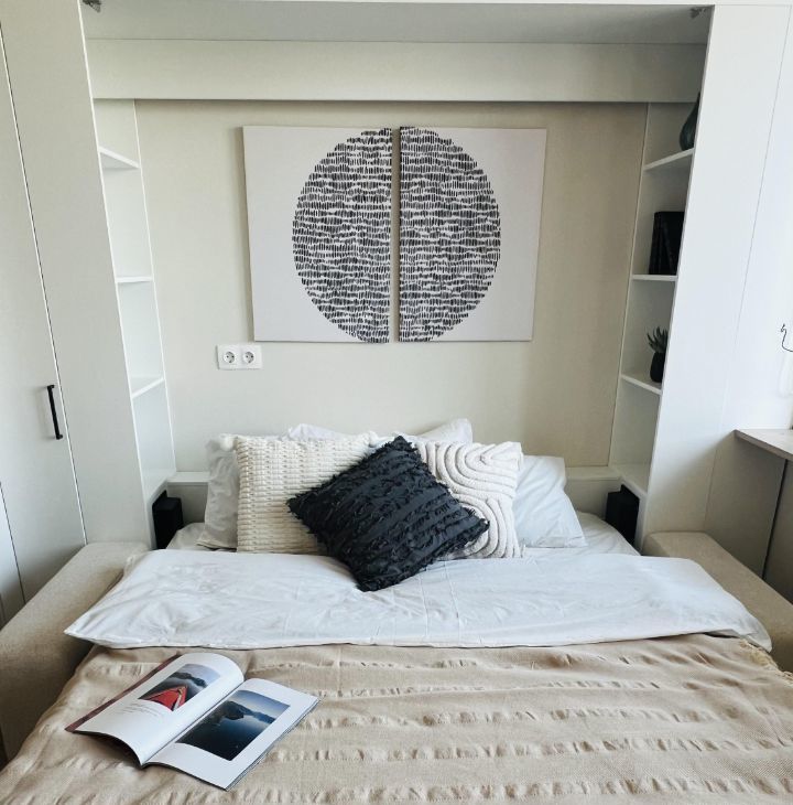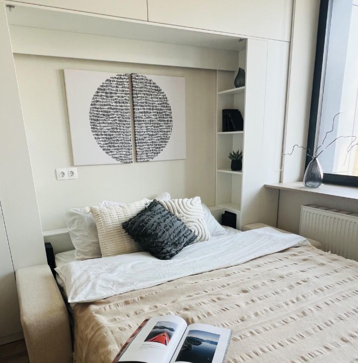 - Кровать-трансформер 160х200 с ортопедическим матрасом, белоснежное бельё и хлопковый плед — для вашего удобства и уюта.
