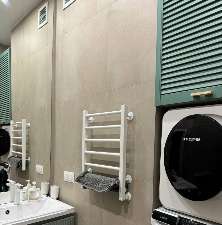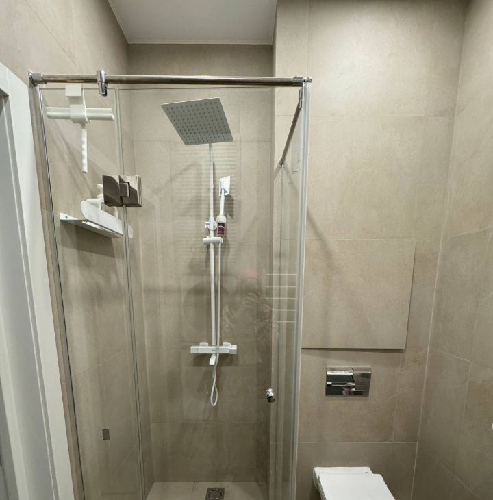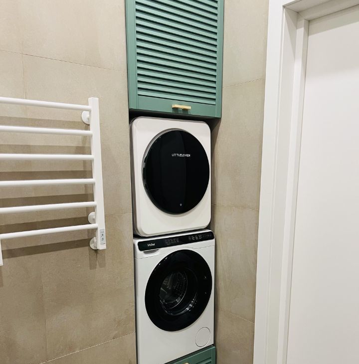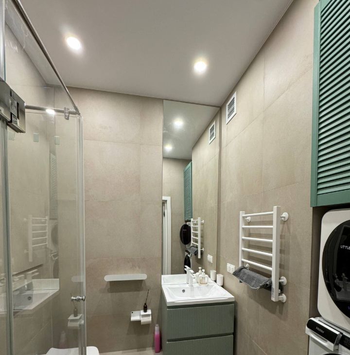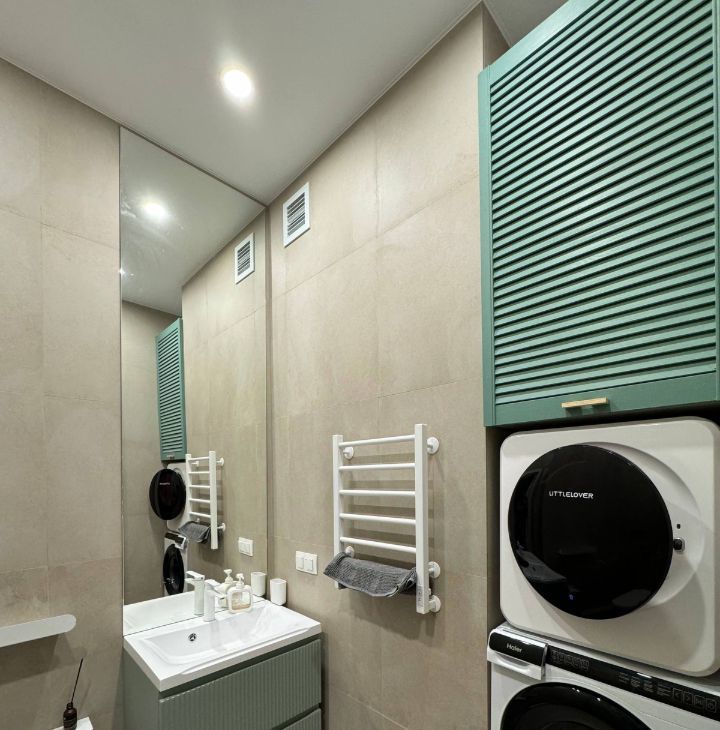 - Ванная оборудована сушильной и стиральной машинами, тропическим душем с термостатом и большим шкафом для хранения.