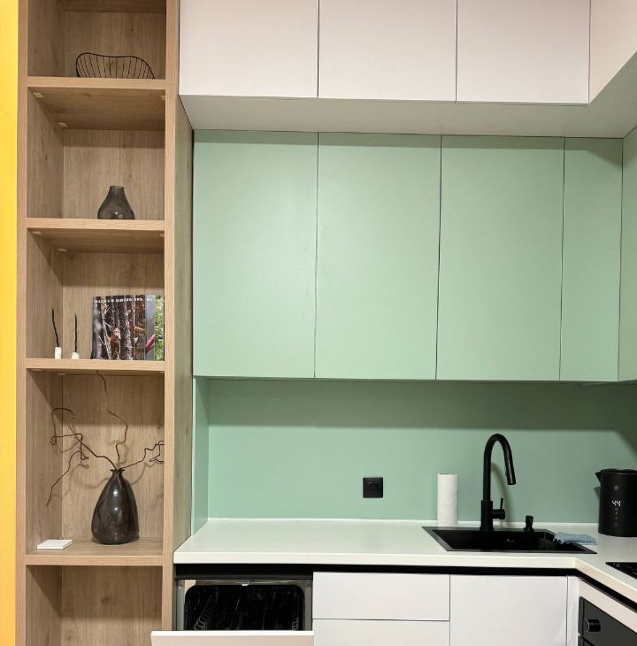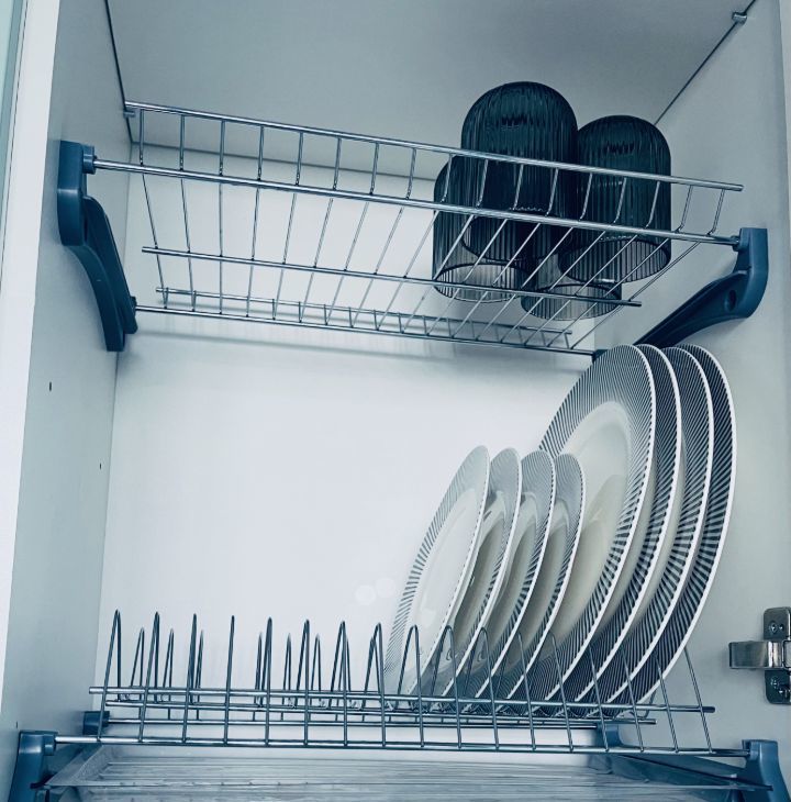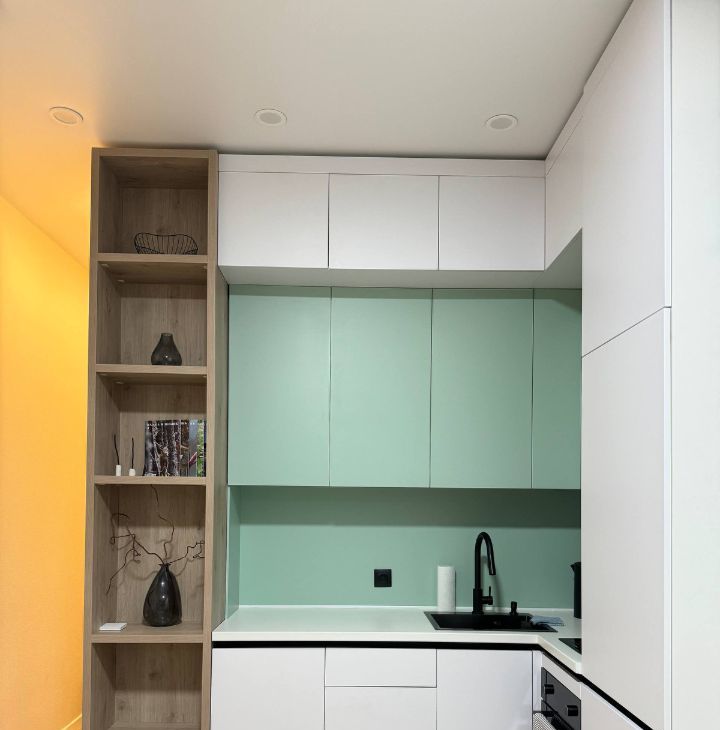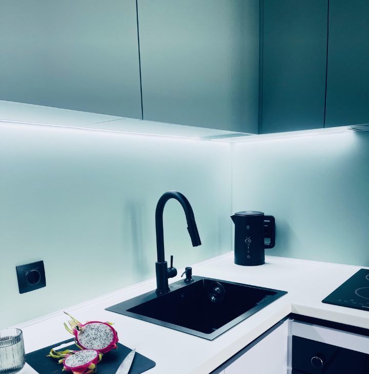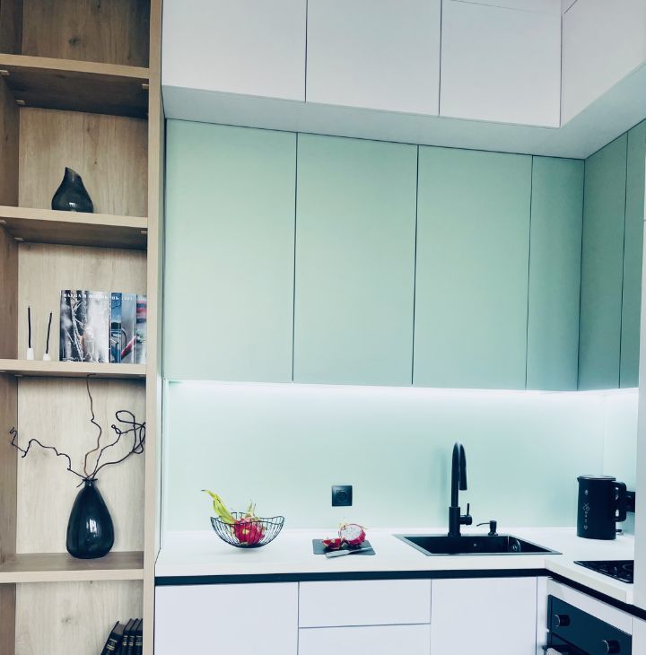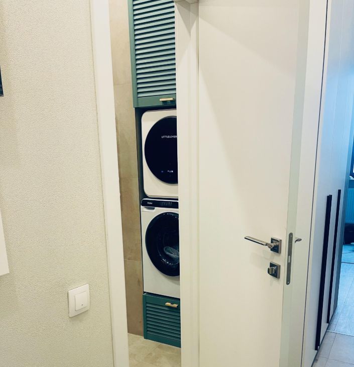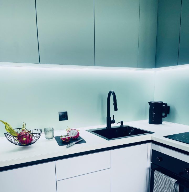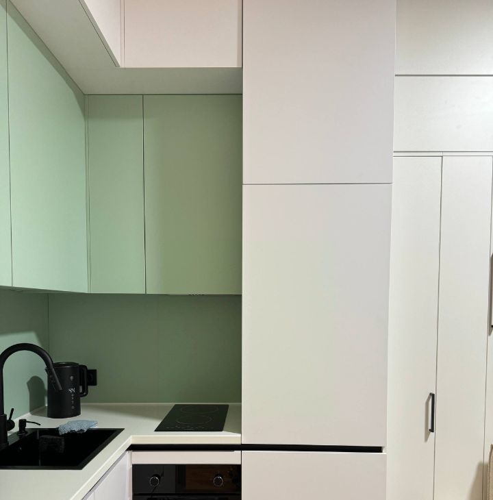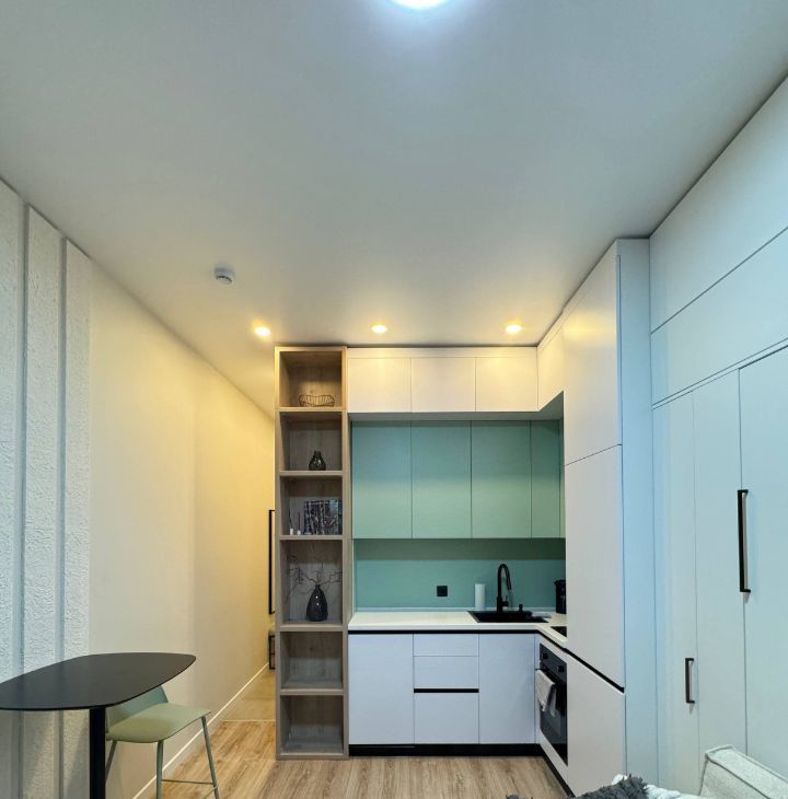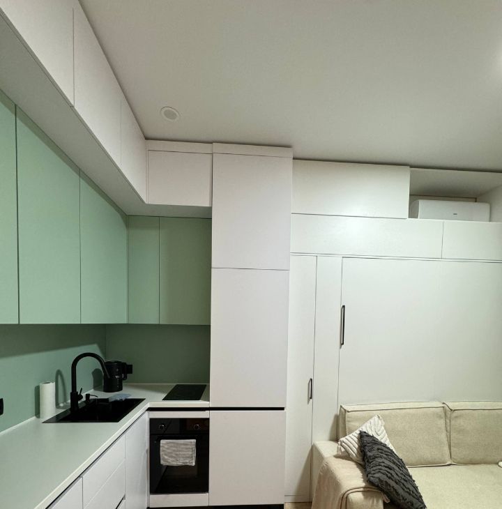 - Полностью оборудованная кухня с индукционной плитой, духовым шкафом, встроенным холодильником и умным электрочайником. Вместительная рабочая зона и качественная посуда включены.