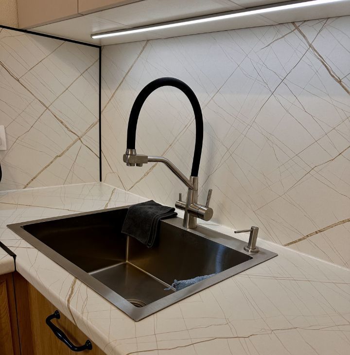 Есть вся необходимая мебель и техника, ( большой встроенный холодильник, посудомоечная машина, плита, духовой шкаф, встроенная микроволновая печь, стиральная машина). посуда, пастельное белье, полотенца, утюг, фен, чайник, капсульная кофемашина.