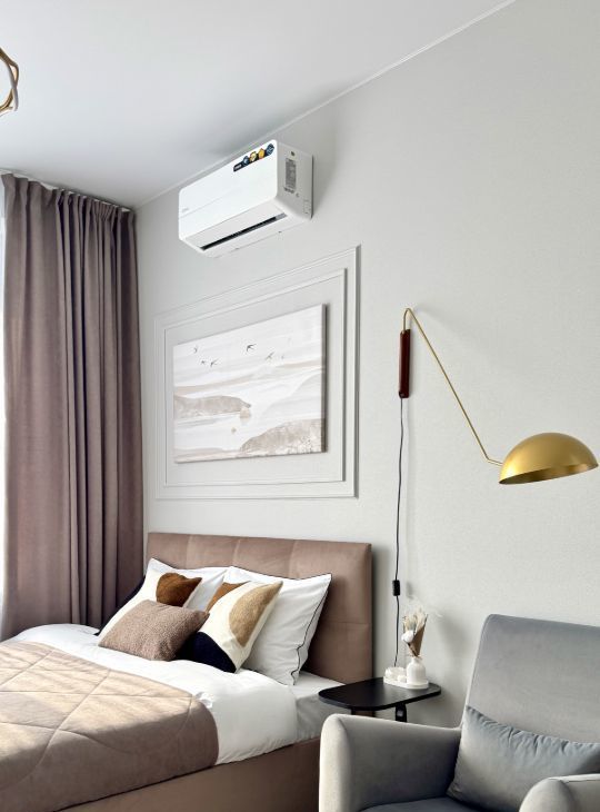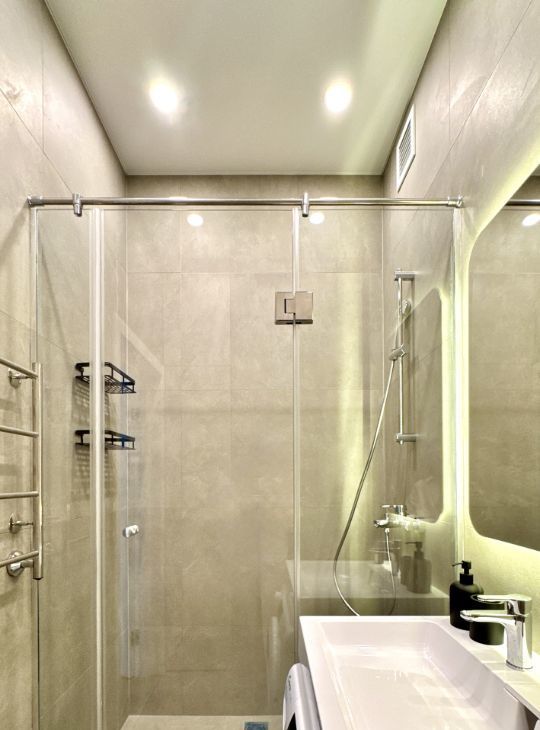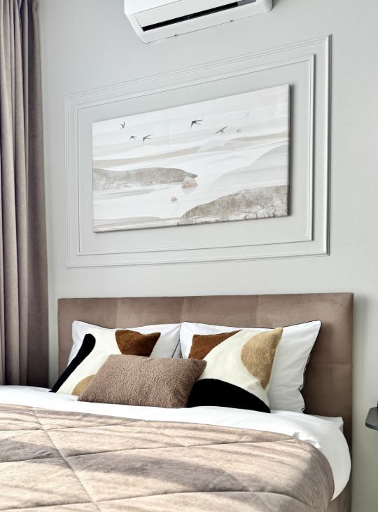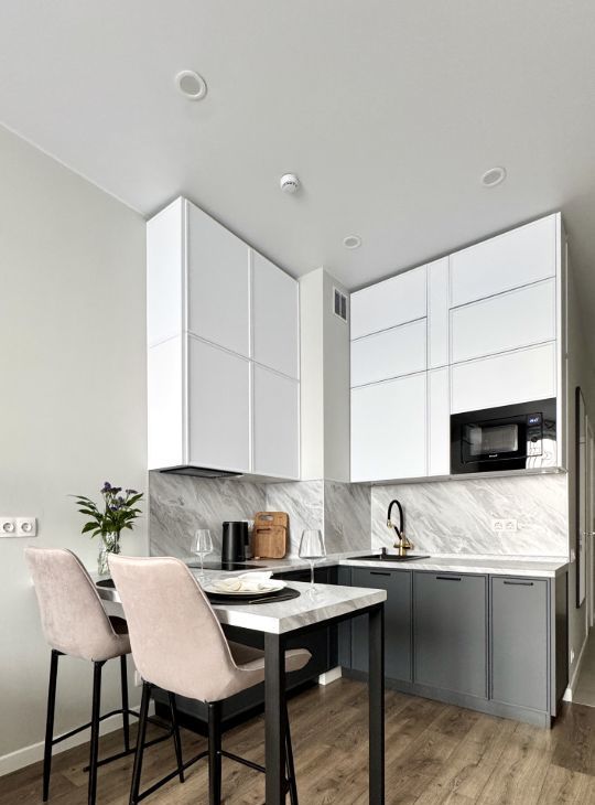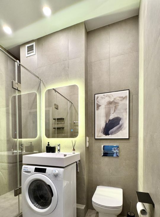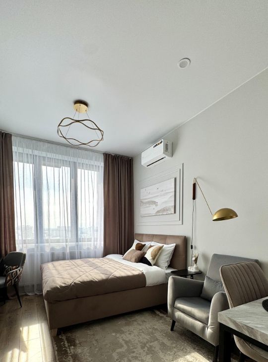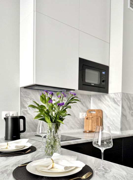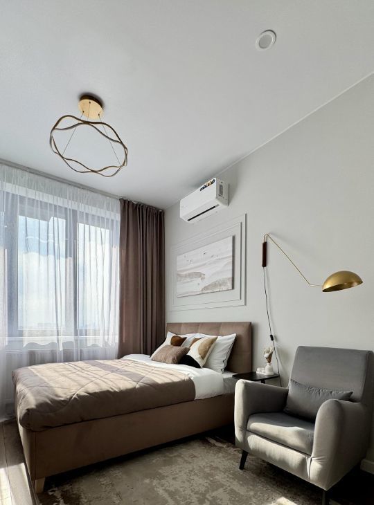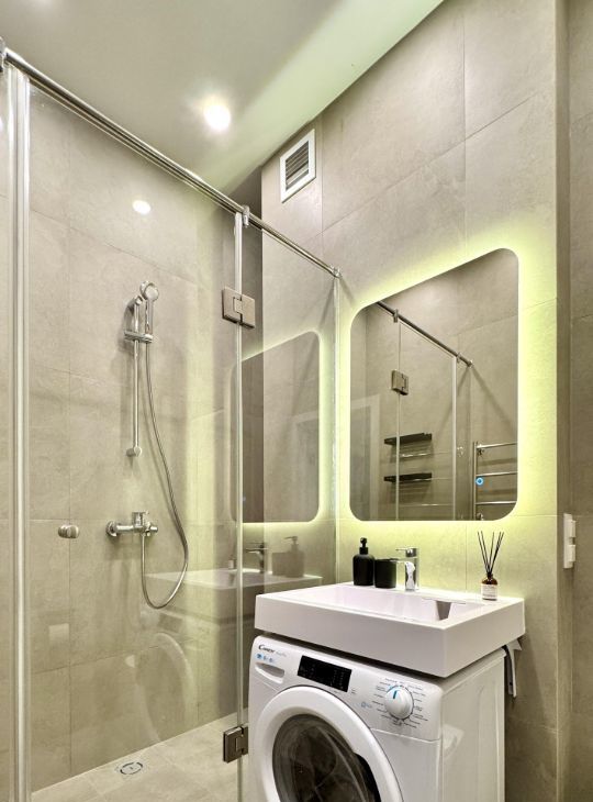 Квартира укомплектована мебелью, а также всей необходимой техникой: ТВ, стиральная машина с функцией сушки, встроенный холодильник, варочная панель, вытяжка, встроенная СВЧ, посудомоечная машина, фильтр для воды, кондиционер.