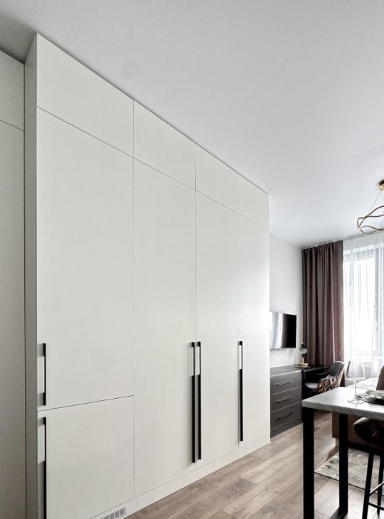 Для вас создано большое количество мест хранения: шкафы и кухня в потолок, кровать с подъемным механизмом и матрасом 160*200 см.