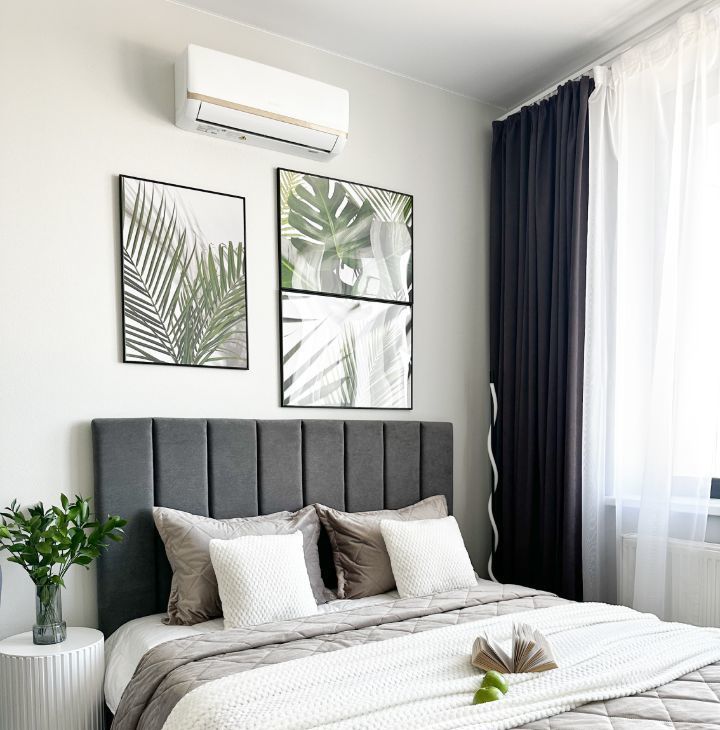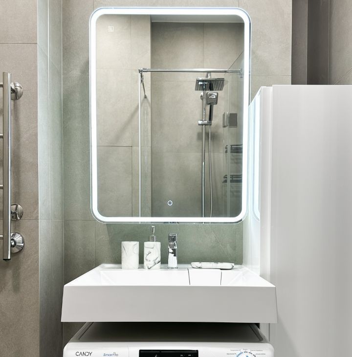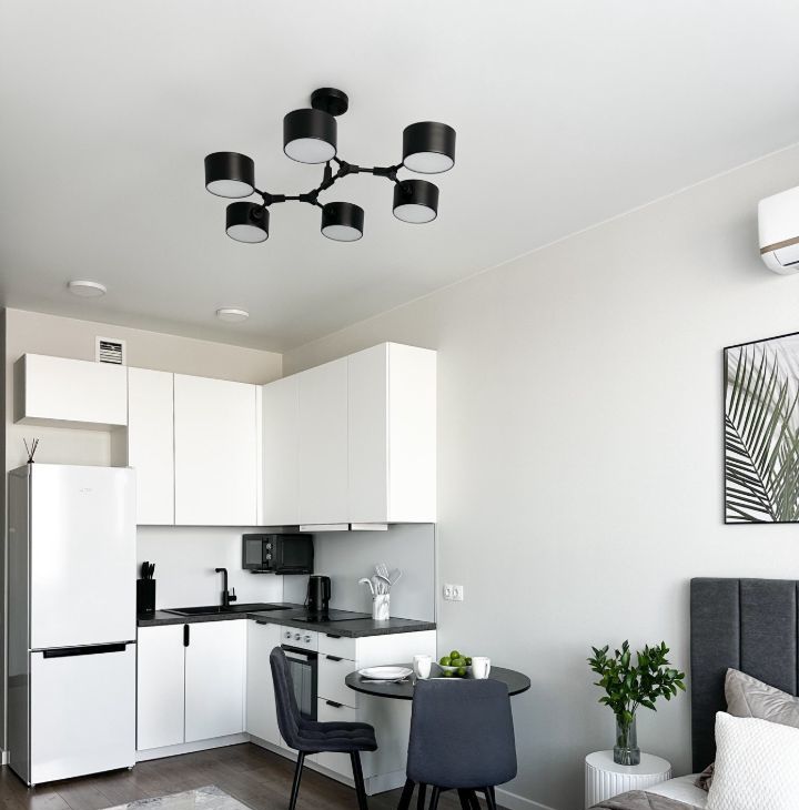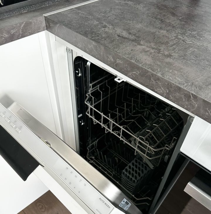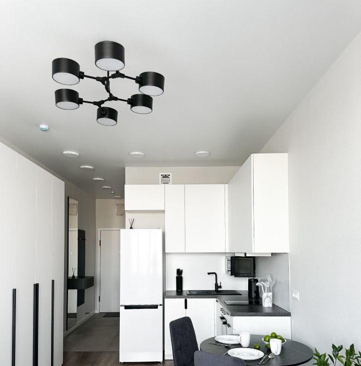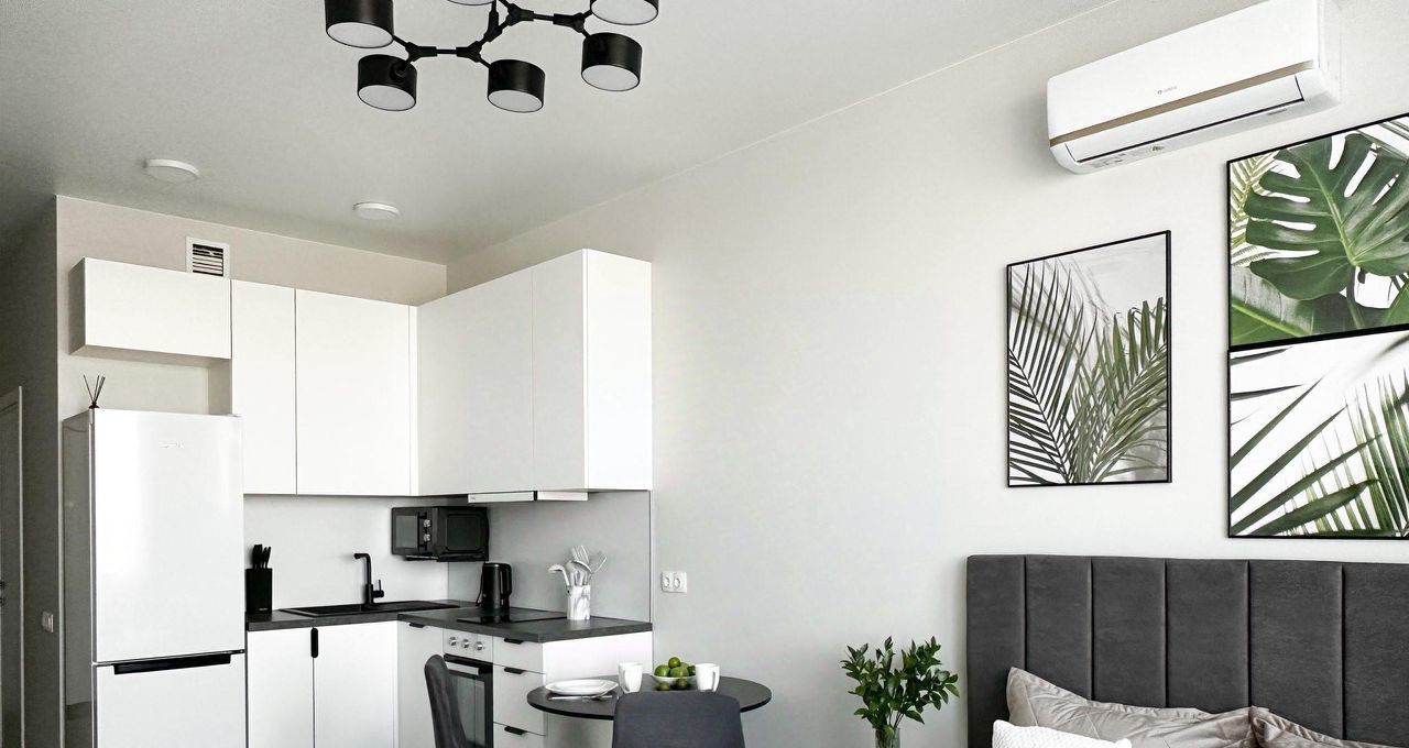 Бытовая техника: стиральная машина, холодильник, посудомоечная машина, духовой шкаф и микроволновая печь, варочная панель и вытяжка, телевизор, кондиционер.