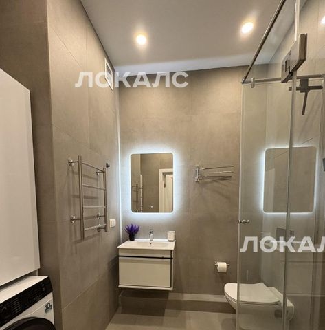 Ванная комната оборудована современной душевой кабиной, стиральной машиной , зеркалом и тумбой.