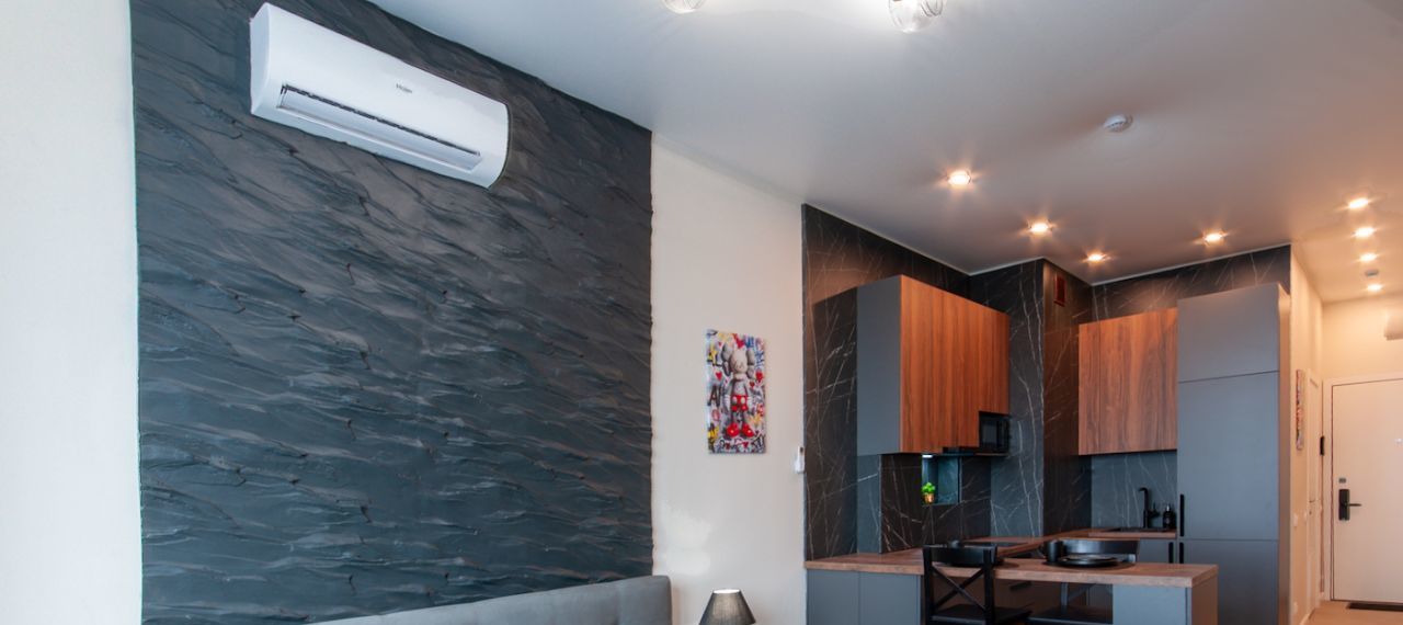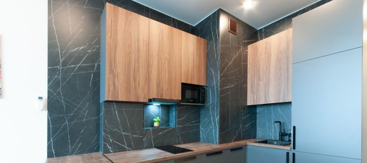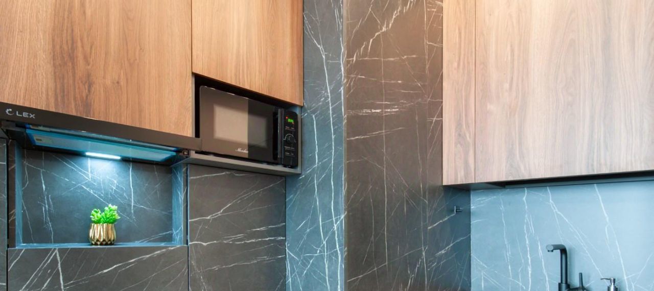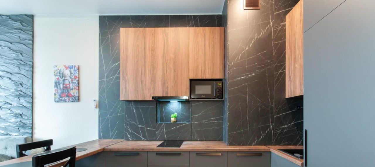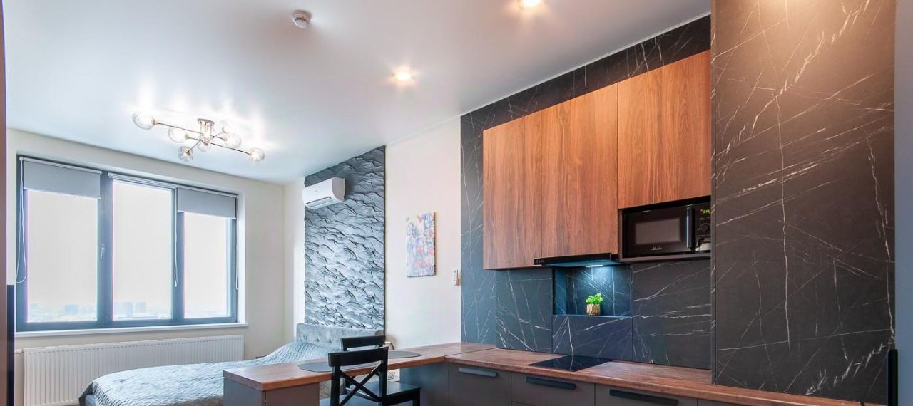 Ремонт в квартире выполнен в современном стиле. С большим вниманием подобрана вся мебель, освещение и техника (варочная панель, микроволновая печь, вытяжка, посудомоечная машина, двухкамерный холодильник, стиральная машина, телевизор, кондиционер). Квартира также оснащена просторной туалетной комнатой с душевой.
