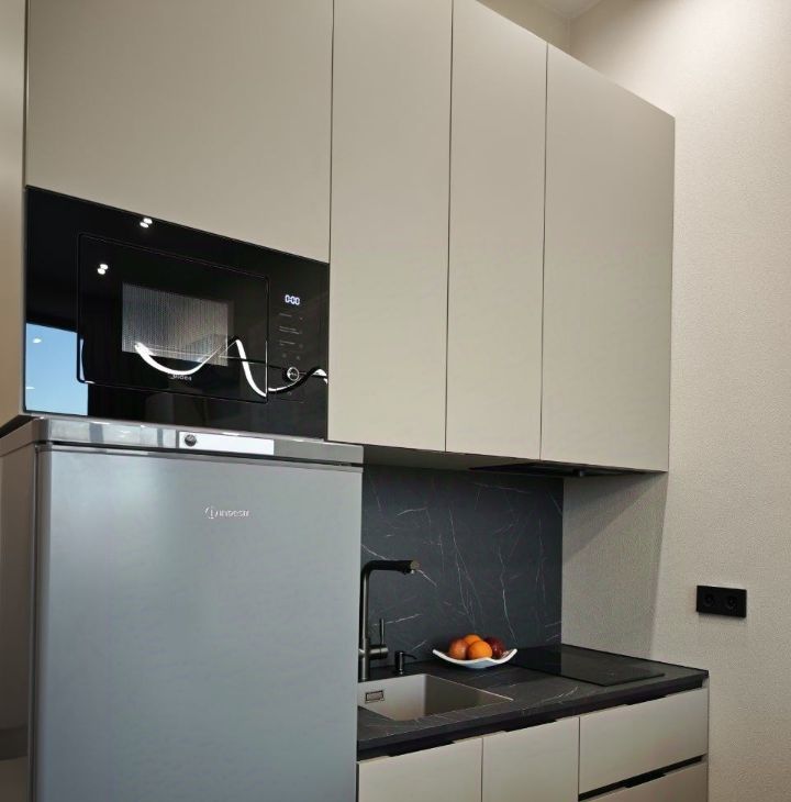 - полноценная кухня с индукционной варочной поверхностью, мойкой, микроволновой печью и фильтром для воды.